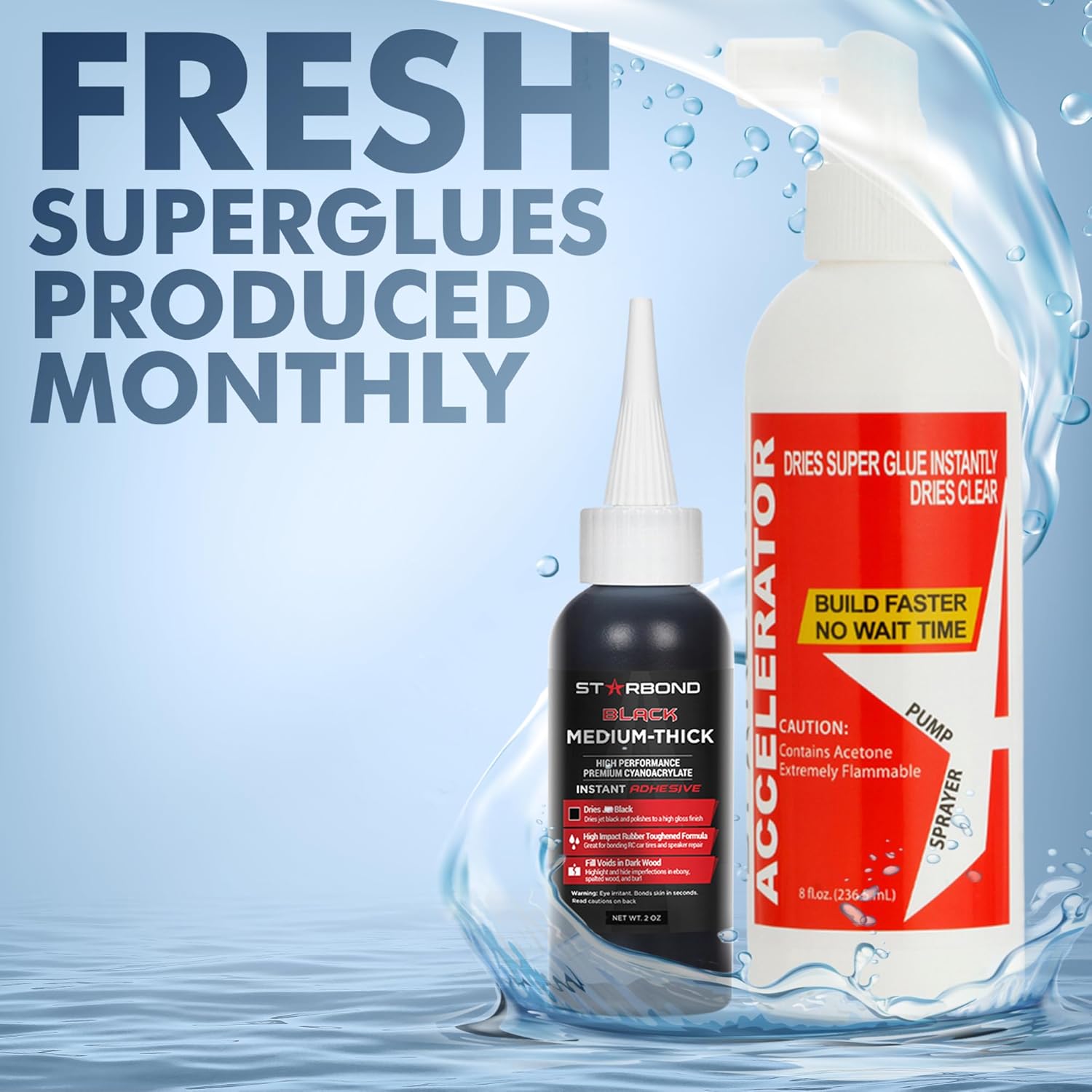 - ā PREMIUM CYANOACRYLATE SUPER GLUE - LAB TESTED FOR OPTIMAL PERFORMANCE: High performance industrial grade adhesive. Starbond Black Medium Thick CA and Accelerator is a reliable time efficient system used to fill small wood knots, cracks, voids, and bug holes. Applying the glue in thinner layers around is recommended for larger and deeper voids.