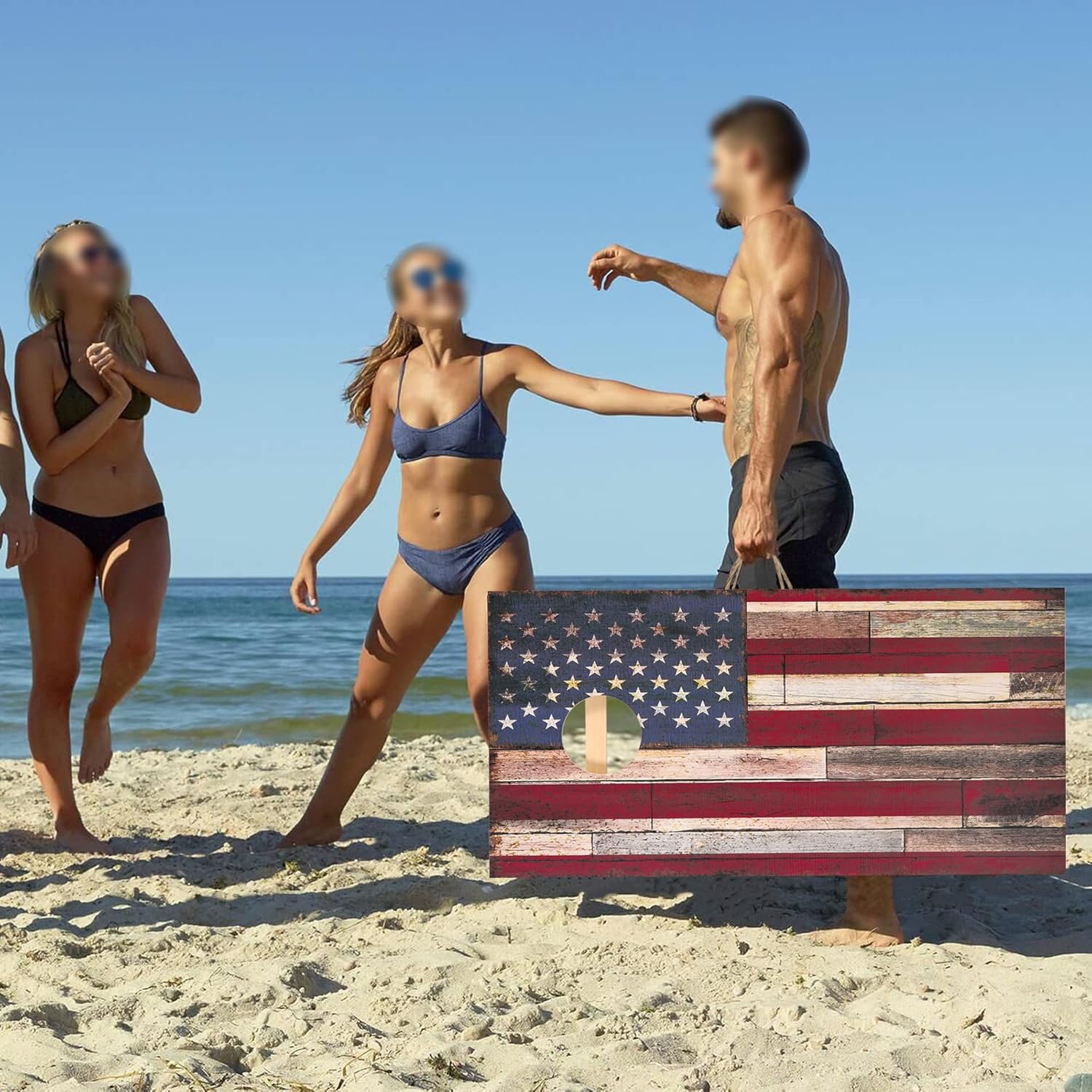 - PATRIOTIC AMERICAN FLAG PATTERN DESIGN: Cornhole boards are varnished with vintage flag graphics by latest heat-pressing and printing technology, providing protective layer to prevent scratching and fading, perfect cornhole game set for outdoor and indoor. The Stars and Stripes design looks so cool and it can be a good choice for gifts.