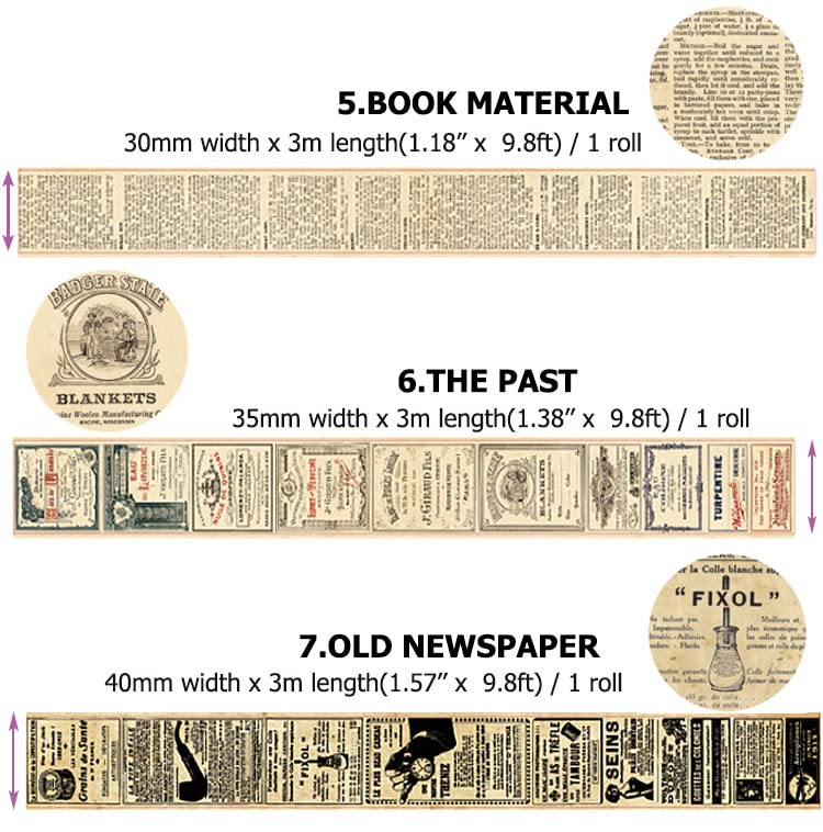 - 10 VINTAGE DESIGN TAPES - Set of 10 rolls of paper tape with different patterns, each roll is 9.8ft/3m in length, designed in nostalgic and retro styles, contains Nostalgic Newspapers, Retro Maps, Old Book Material, Art Manuscripts, Old Bills, Writing Notes, Coupons, Letters, Newspaper Material, and Past Events.