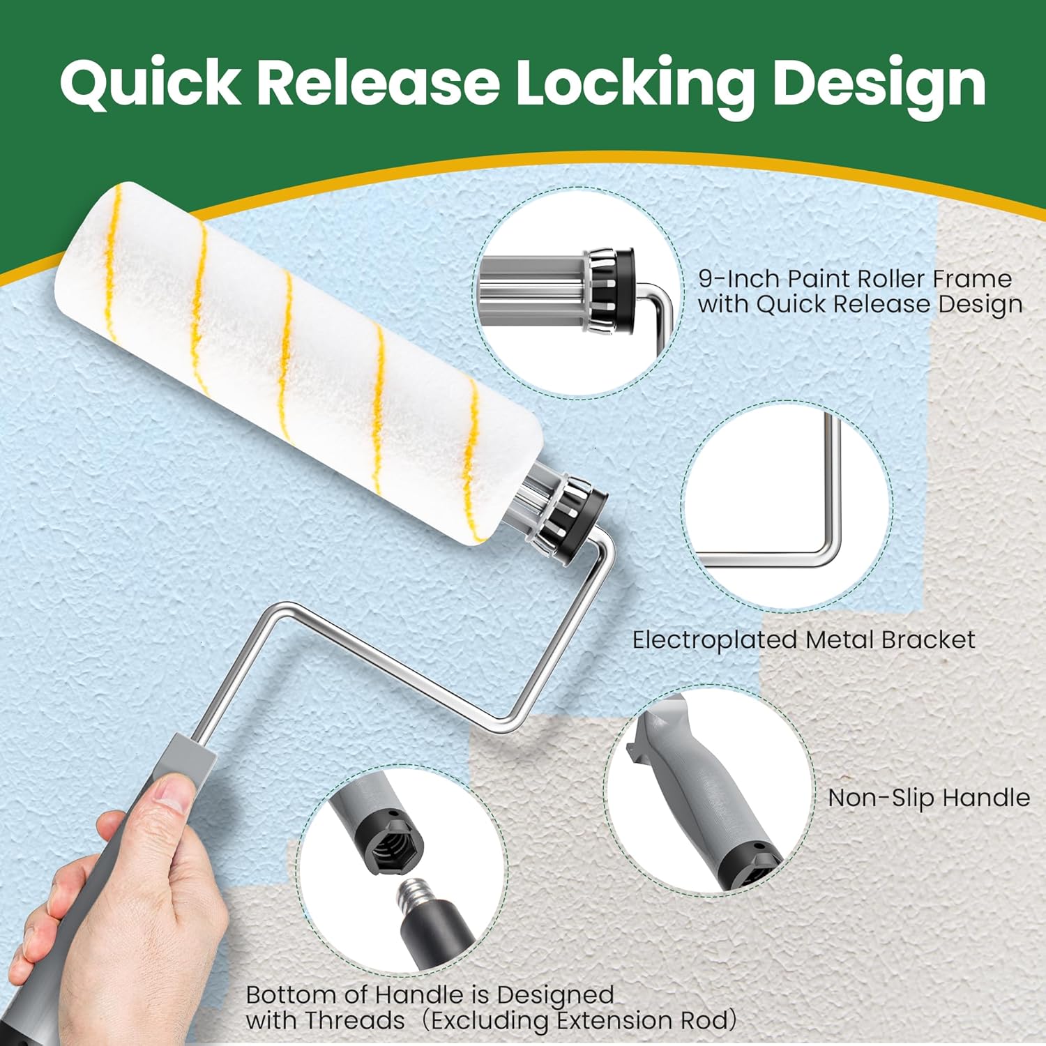 - SAVE VALUABLE TIME AND MONEY :This paint brush roller set comes with everything you need for projects around the house, 9" paint rollers help you get a smooth finish, 4" mini rollers are great for tight spaces, you'll get beautiful finishes and save valuable time and money
