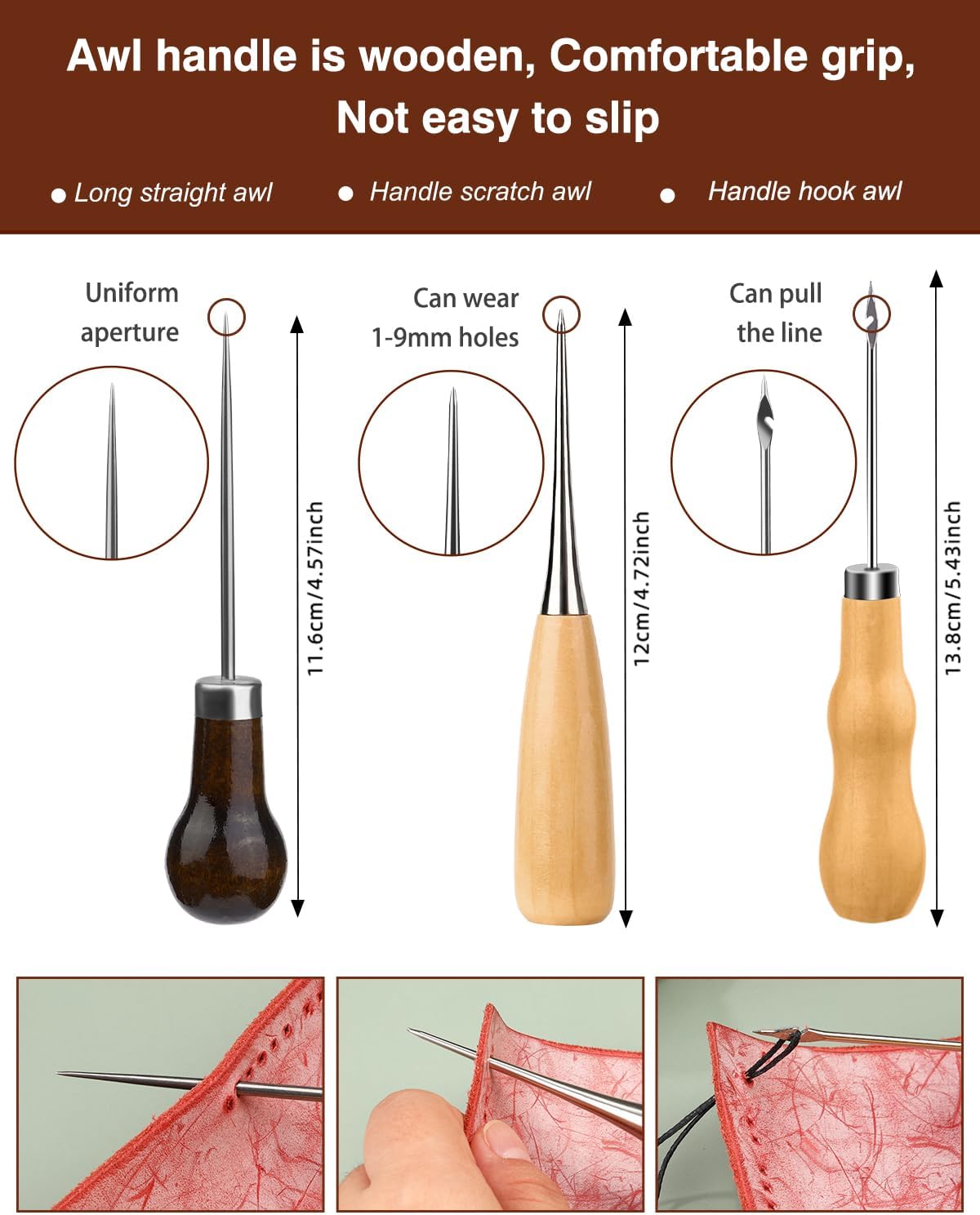 - Sewing Awls: leather stitching kit contains 3 type awls with different functions, long straight awl for punching holes, scratch awl for enlarging the hole, can wear 1-9mm holes, hook awl for hooking the thread and sewing, perfect sewing awl Combination does not require you to purchase separately.