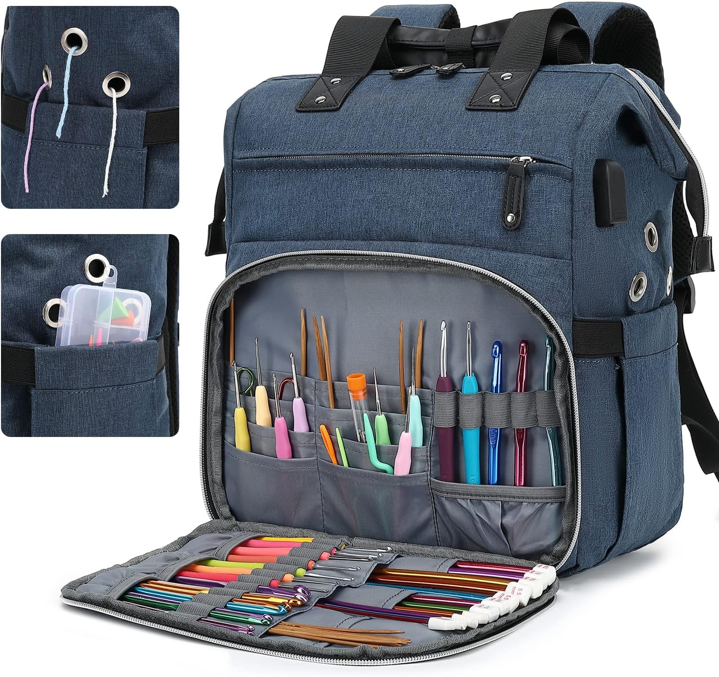 Crochet Backpack,Knitting Bag Backpack Yarn Storage Organizer Travel Crochet Bag with USB Charging Port,Large Yarn Tote Bag Yarn Holder Case for Knitting Needles,Crochet Hooks,Crochet Accessories,Blue