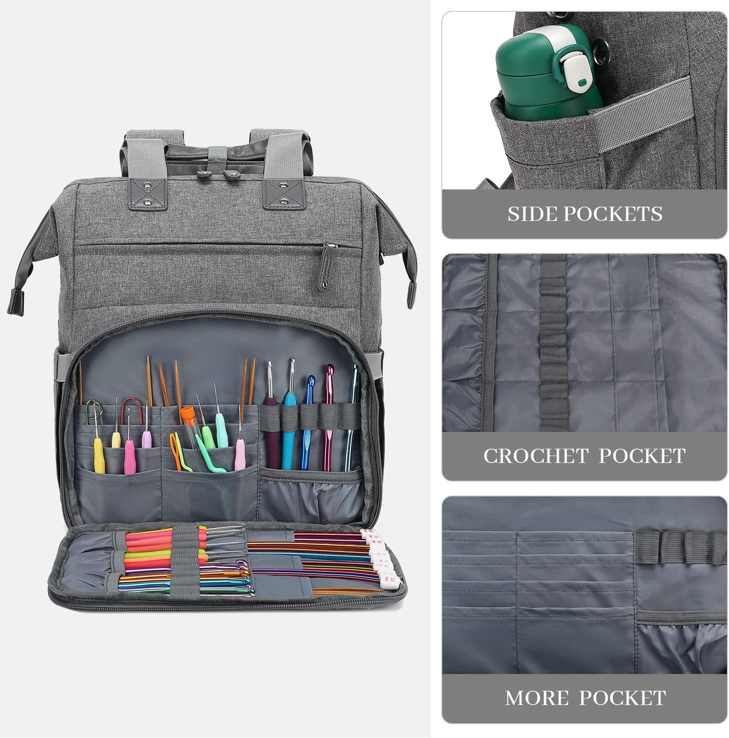 - Lots of Pockets & Compartments: 6 inner pockets with elastic straps fit up to 14βknitting needles and 3 clear inner pockets allow you to put your daily necessities. Front pouches and elastic loops for crochet hooks and accessories, side pockets for water bottle or umbrella, The oversized anti-theft pocket on the back of the backpack makes it easy to put your phone, passports, wallet and more.
