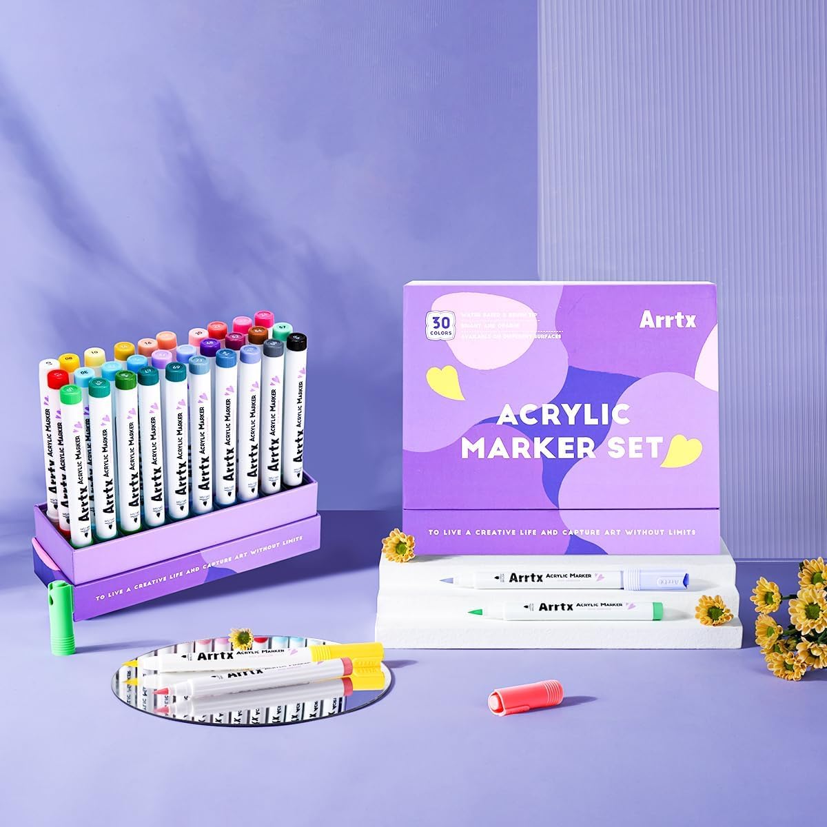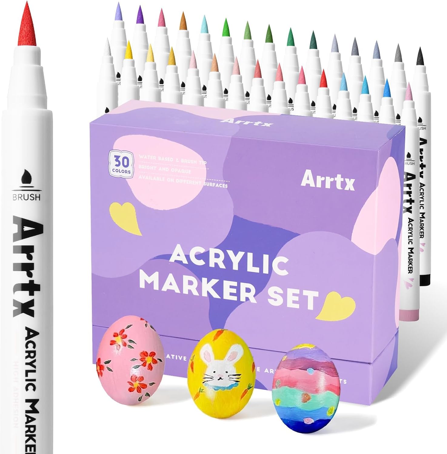 Arrtx 30 Colors Acrylic Paint Pens for Rock Painting, Extra Brush Tip, Water Based Paint Markers for Stone, Glass, Easter Egg, Wood and Fabric Painting-No Toxic,No Odor