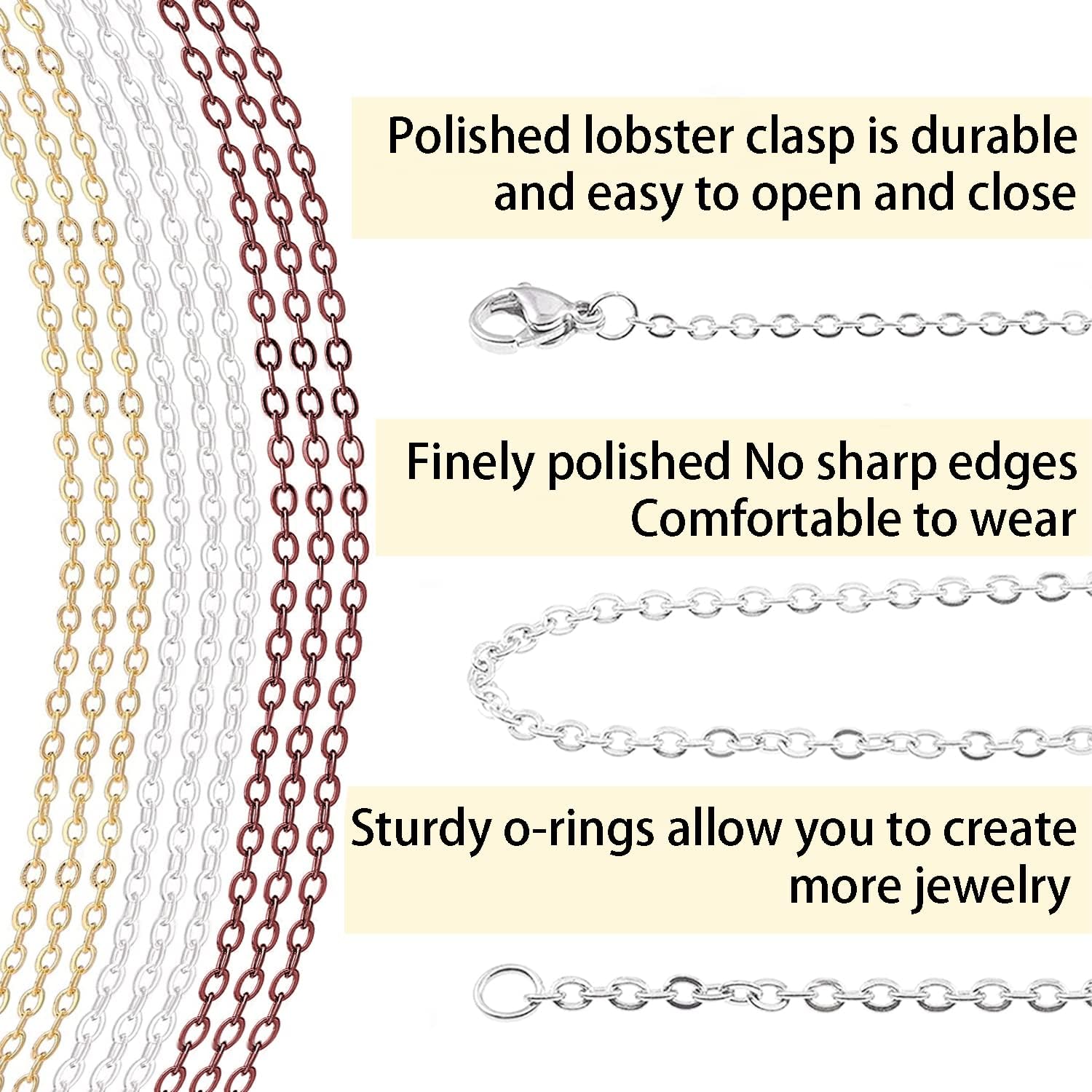 - THIN & STRONG: The size of the chain links are 2.5mm long, 2mm wide, 0.5mm thick; the lobster clasps are 10mm long, 5mm wide; the jump rings are 4mm long, 4mm wide - Small, fine, but strong and sturdy. Great for jewelry making findings supplies.