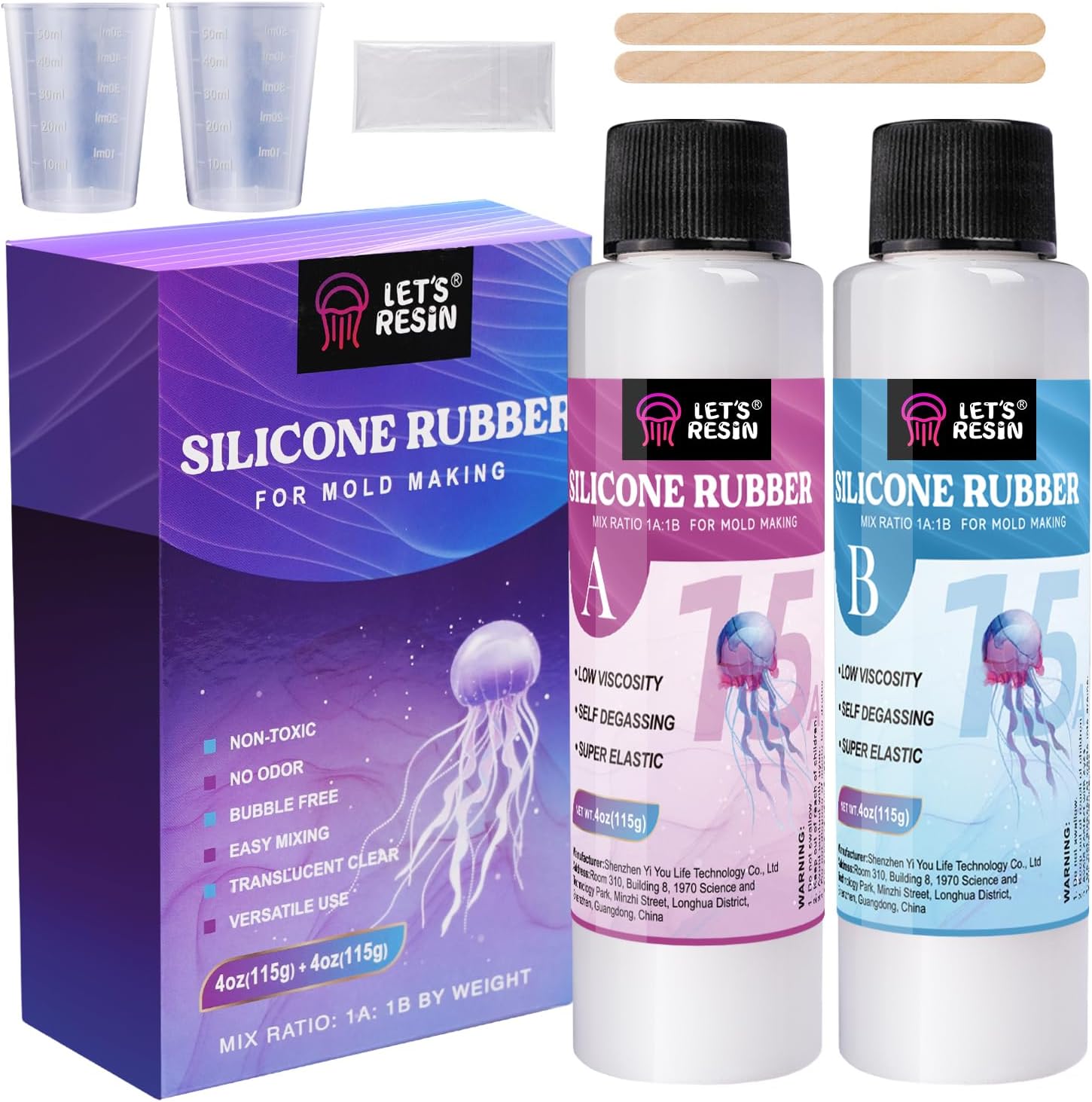- 【All in One Silicone Kit】: This starter kit comes with 8oz silicone rubber, stirring wood sticks x 2 pcs, 100ml plastic measuring cups x 2 pcs; disposable plastic gloves x 2 pcs; If you're new to silicone mold-making and afraid to fail, LET'S RESIN silicone mold making trial kit is a perfect choice for you to try without costing you a lot, provide everything that you need to get started.