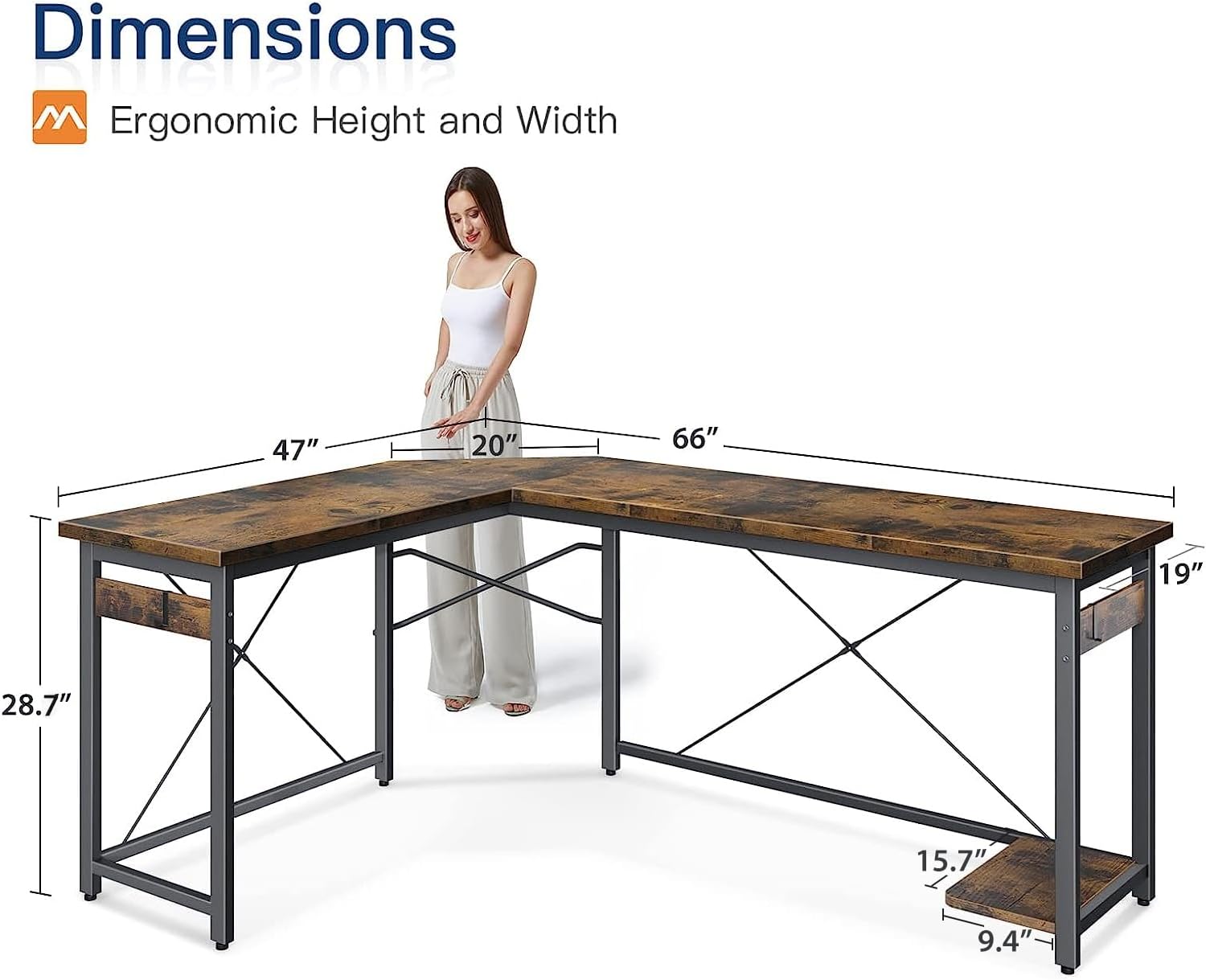 - Large Size & Ample Space: 66.1"(L) x 47"(W) x 19"(D) x 28.5"(H). Large space for an l shaped computer desk, great choice for home office activity, gaming and writing work. Desk Height: 28.5". Plenty of legrooms for rest and for storage. This l shaped desk is equipped with CPU stand, which you can storage your computer tower perfectly.