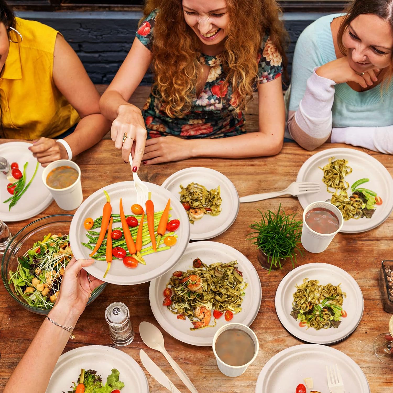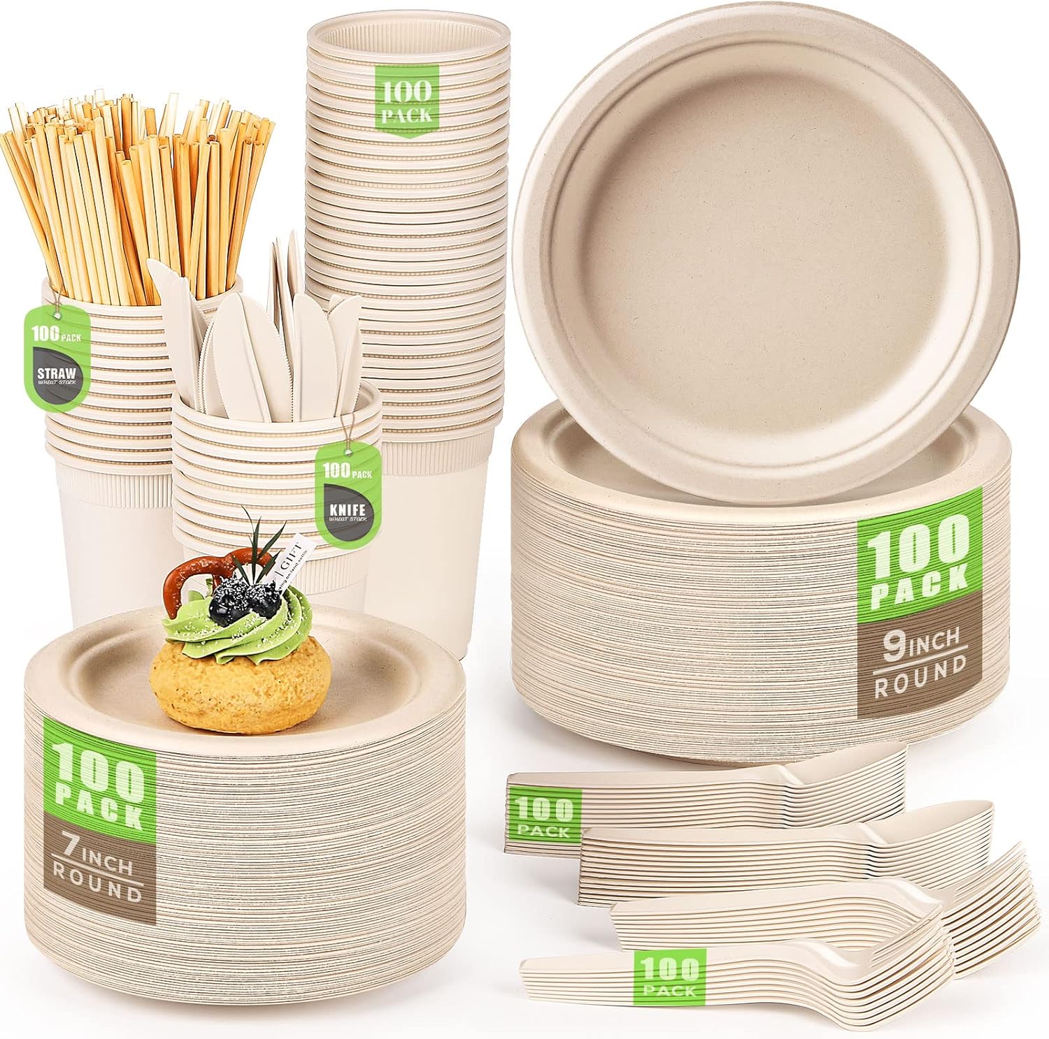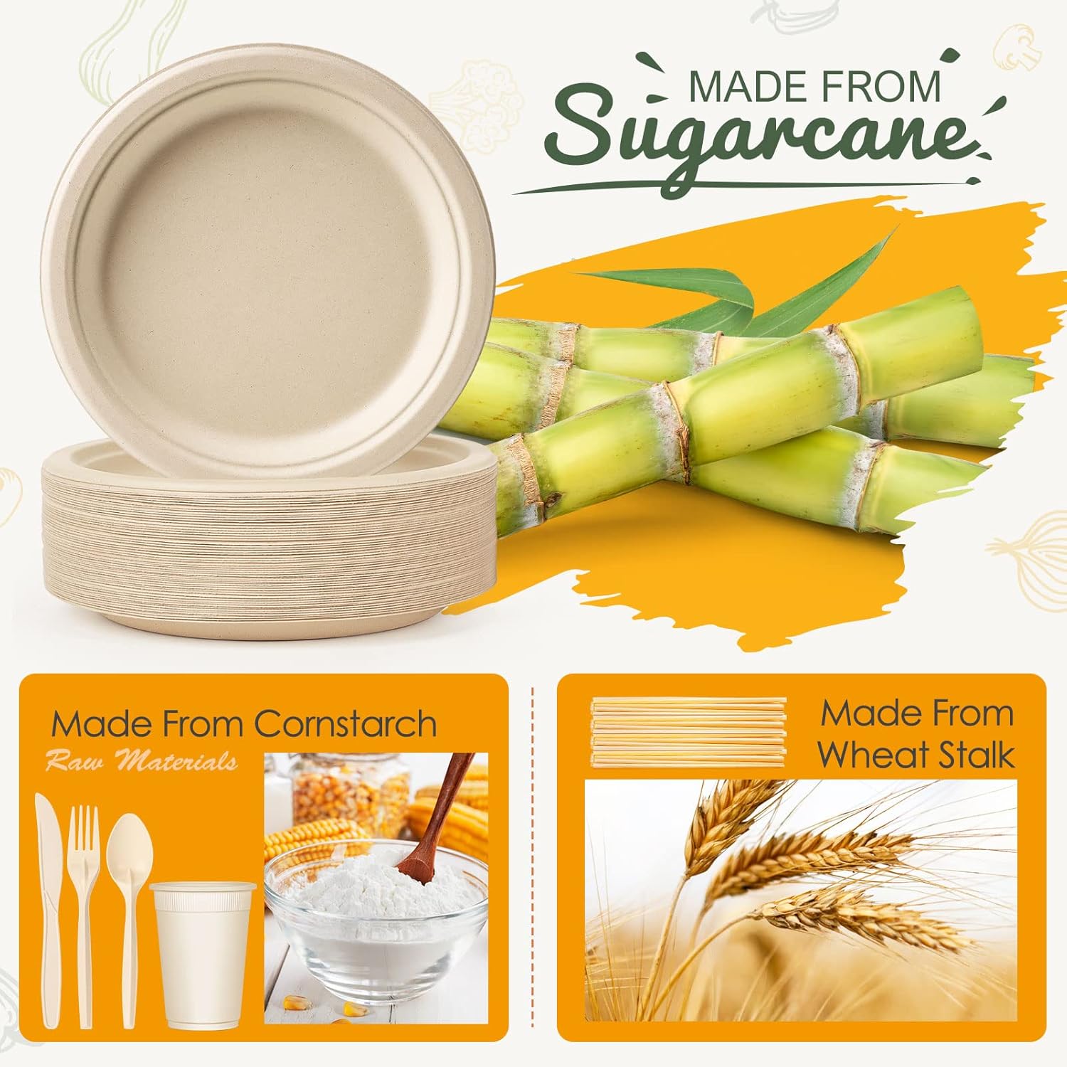 - 【Natural Material】 The compostable plates are made from 100% sugar cane fibres and the cutlery are made from cornstarch, which is plant-based, able to be dissolved by the environment