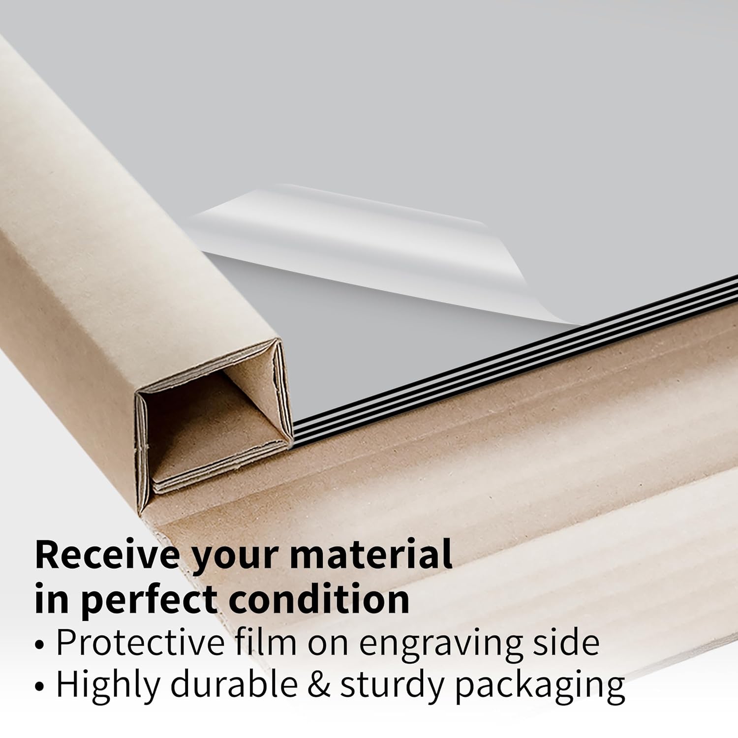 - Technical Data: Size: 12"x20" | Thickness: 0.06” (1/16", 1.6 mm) | Engraving depth: 0.003" (0.8 mm) | Top Color: Smooth Silver | Core Color: Black (RAL 7021) | Transmittance: Opaque