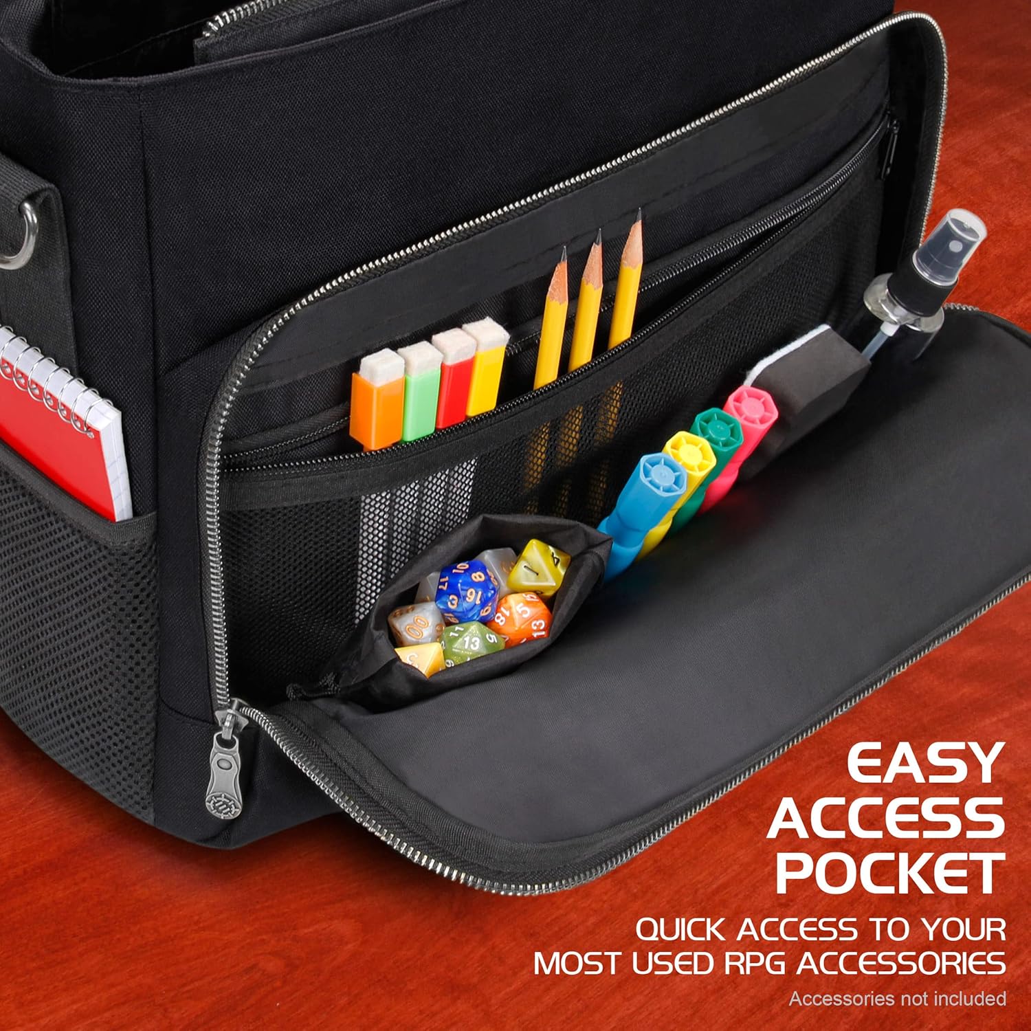 - LARGE LOOT POCKET: Spacious zippered front pocket can store dice, pencils, markers, tokens, small journals and much more to hold your entire game night in one convenient travel bag