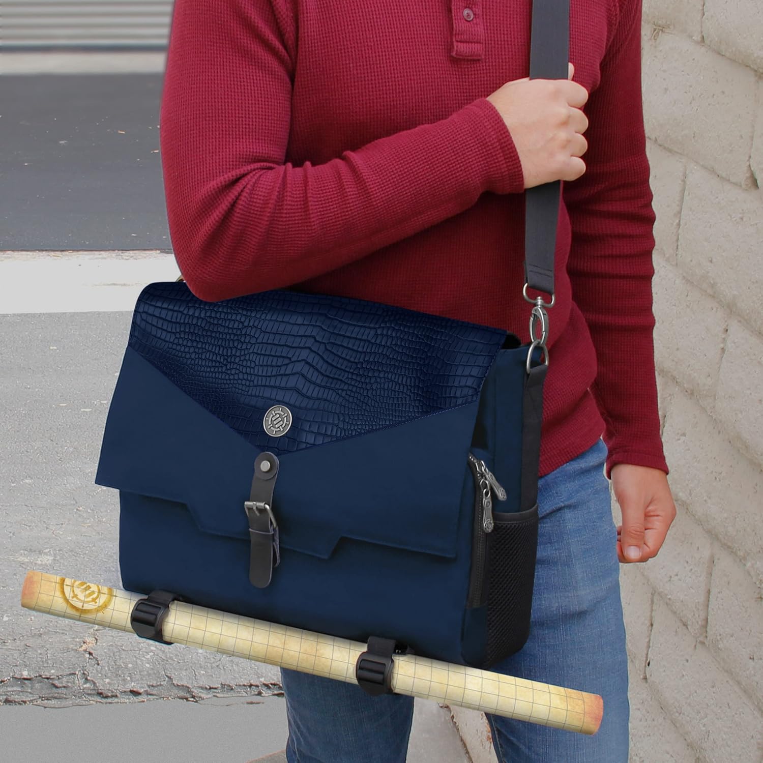 ENHANCE Collector's Edition RPG Player's Essentials DND Bag - Dragon Hide Exterior Messenger Bag Fits 2-4 Books, Binders, Dice & Accessories, with 17 inch Laptop Slot, Battlemap Straps (Dragon Blue)