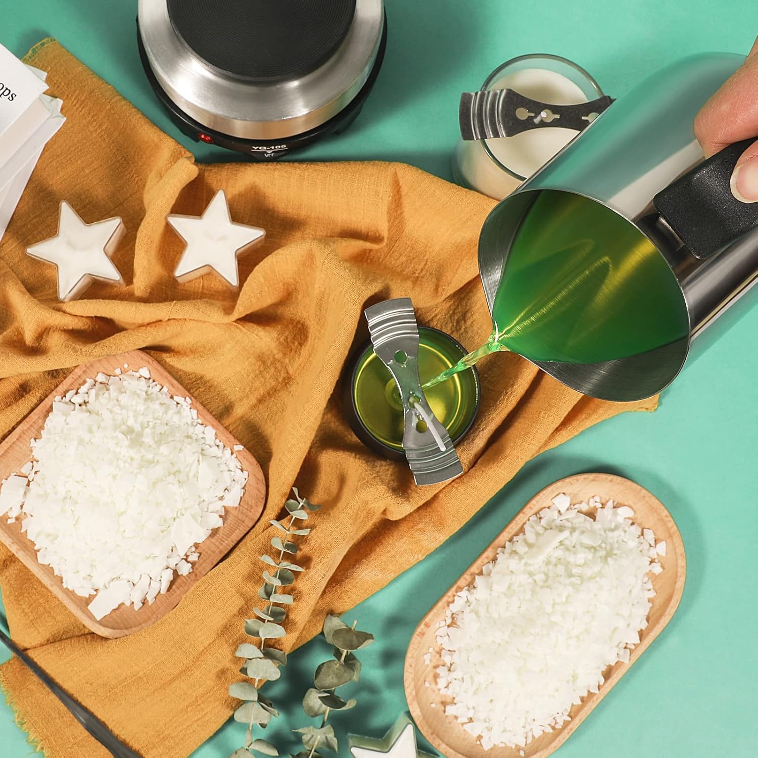 - 【Candle Making Supplies】Includes electric hot plate for candle wax melting, 5lbs of organic soy candle wax, 100 cotton candle wicks, 1 stainless steel pouring pot, 2 stainless steel centering devices, 1 stainless steel spoon.