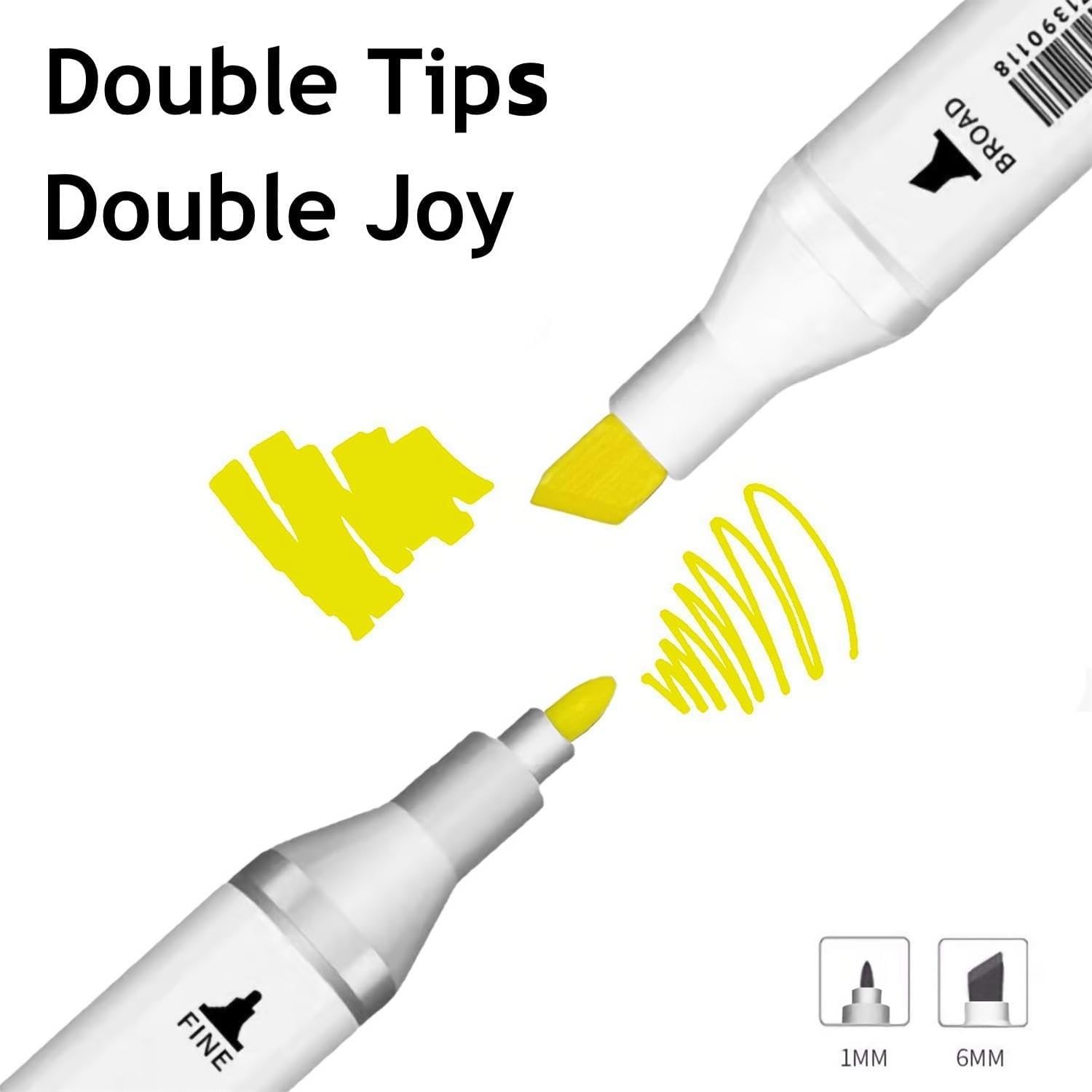 - DUAL TIPS: A 6mm broad tip for quick coverage and a 1mm pointed bullet tip for highlights, shadows, bullet points, sketching and general writing. Clean thick, thin or brushed lines can be achieved with ease.