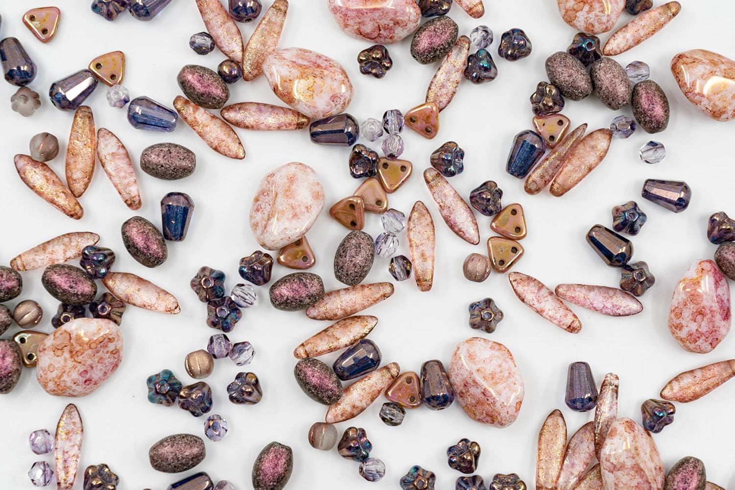 2.1oz (60 g) Mix of Unique Czech Bohemia Glass Pressed Beads, Matte and Glossy, Hand Made, Antique Copper Pink