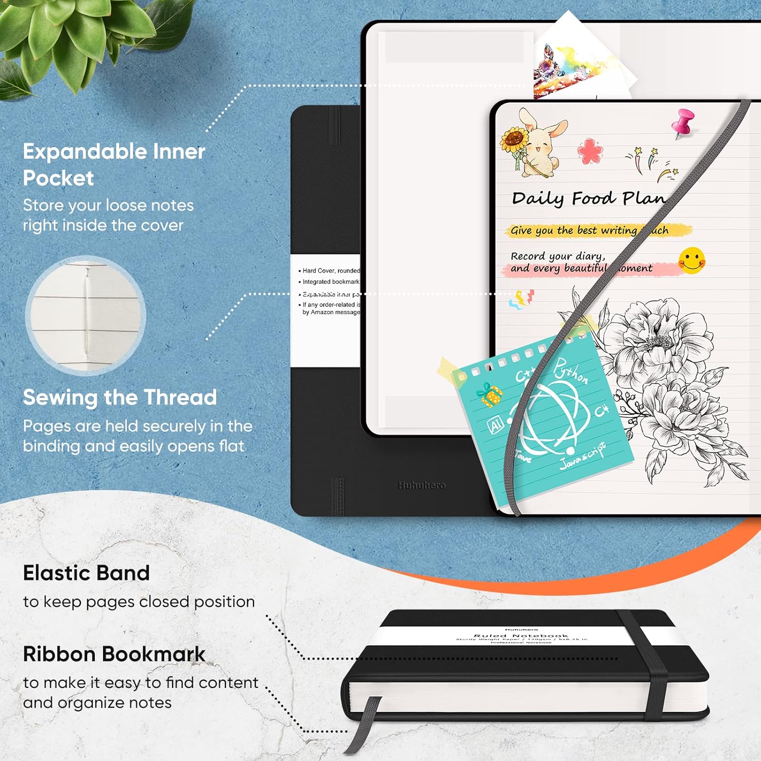 - Expandable Pocket + Elastic Closure Band+ 1 Ribbon Bookmark - The elastic band is strong and the page marker comes in handy. It has a handy-dandy pocket in the back to keep business cards, notes, receipts and other small paper items. Huhuhero notebook journal will provide comfortable smooth writing experience, great for bullet jounaling, studying, journaling, note taking, daily planning, drawing. Premium college supplies, office supplies, art supplies.