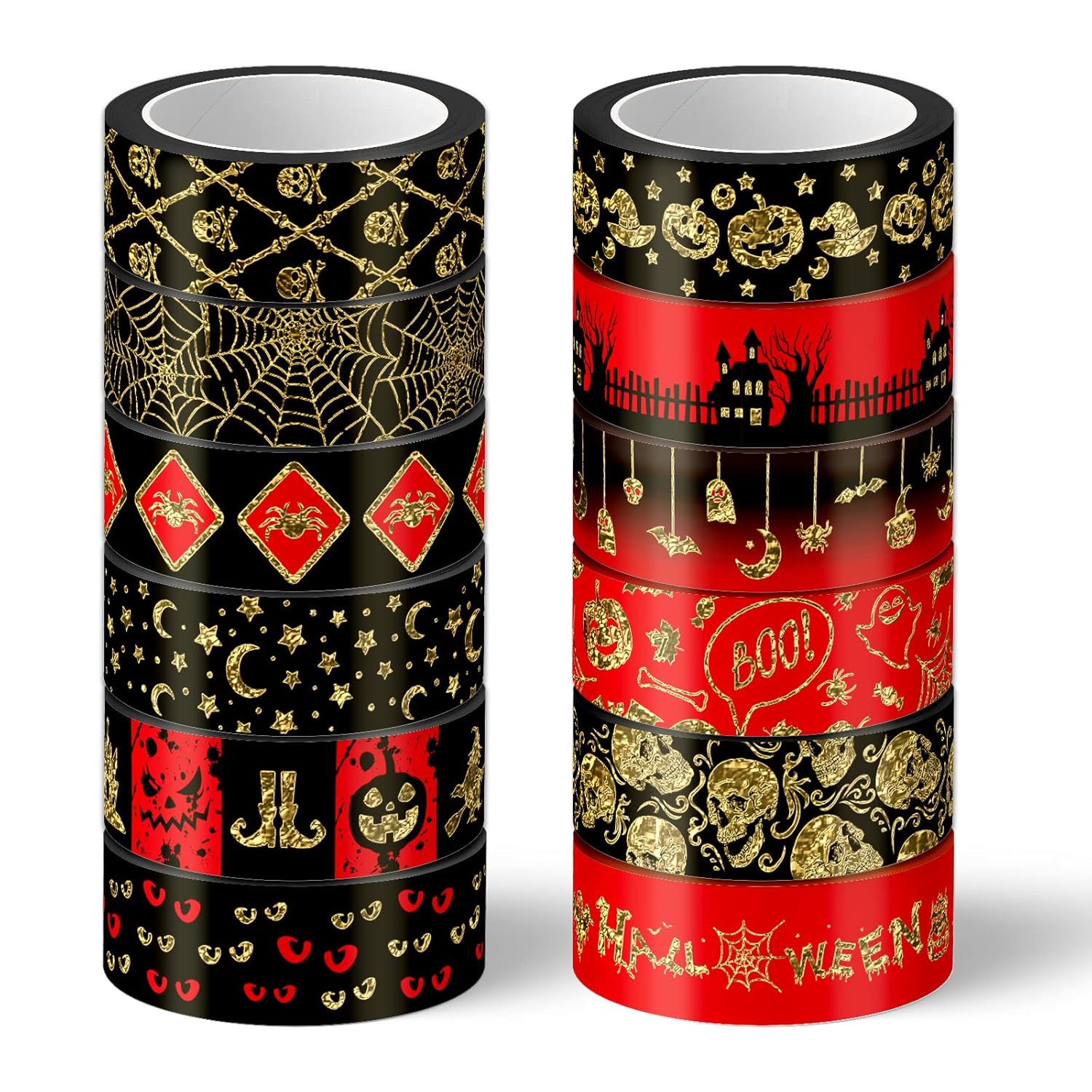 - Halloween Theme - Our Halloween washi tape is designed with various red black foil patterns with skulls, spider webs, grimace pumpkin, stars and moons, etc. Leave an elegant touch to your Halloween gift wrapping and create more mystery.