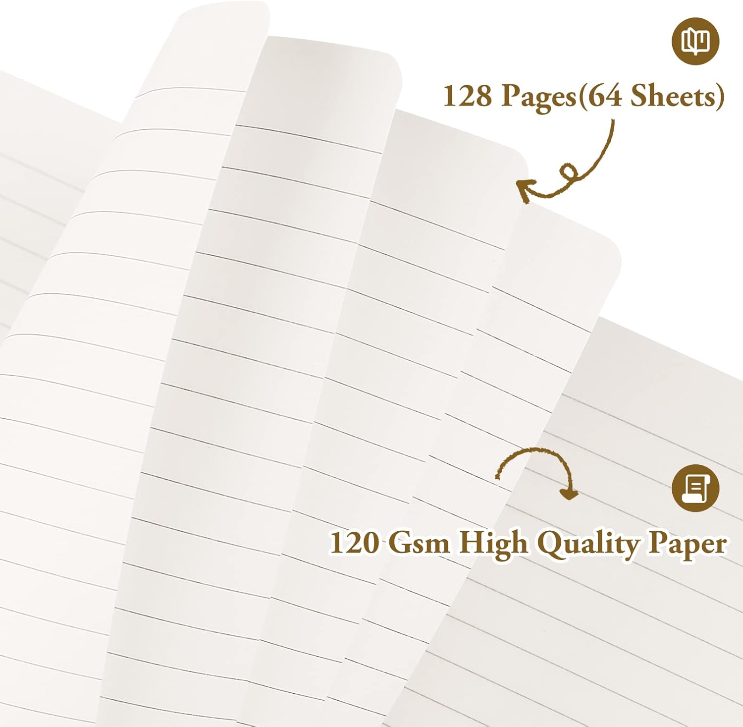 - PREMIUM THICK PAPER NOTEPAD – 128 Pages (64 Sheets) 120Gsm thick lined paper, which is 35% thicker than normal. Suit for most pen types, ballpoint pens, brush pens, fineliner pens, glitter pens, EXCEPT Alcohol-based Markers. The paper resists damage from light and air and the paper protects your eyes from irritation. Lines width 6mm. Size: 5"X8.25", Perfect size for carrying around or put into your bag or purse.