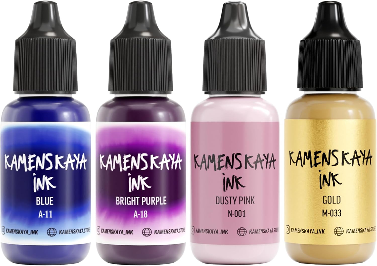 - Set composition: 4 inks 0.51 fl oz (15 ml) each. 2 inks of basic ‘A’ line (light translucent texture, saturated color and a nice satin finish), 1 metallic alcohol ink (natural metallic pigment ink to create golden facets and light cobwebs in your ink art work) and 1 pastel alcohol ink (delicate pastel shade with velvety finish based on dye and pigment, where the pigment provides a dense and opaque layer, while the dye is responsible for the color)