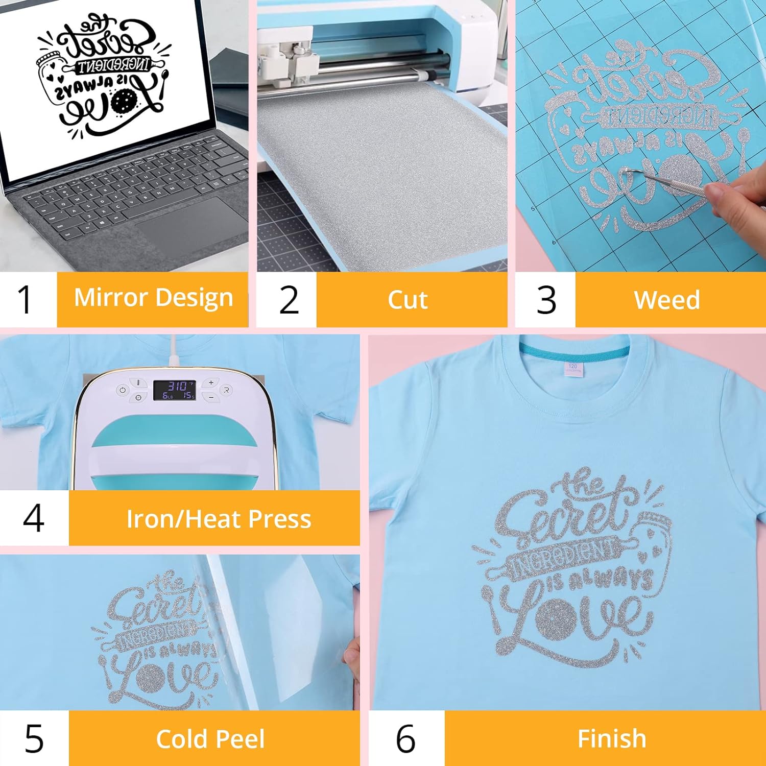 - 【Easy to Cut & Weed & Transfer】Our HTVRONT glitter htv is thicker and smooth. With its good cutting application characteristics, you can get your designs to perfection without wasting excess glitter heat transfer vinyl. At the same time, our glitter iron on vinyl is very sensitive to temperature and pressure, just follow the instructions and you can easily transfer the vinyl to the fabric.