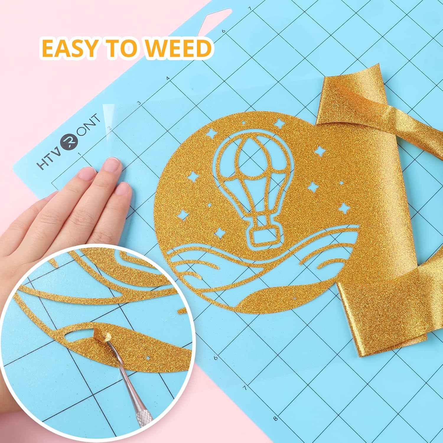 - 【Sparkle & No Residue】Our gold glitter htv vinyl rolls are specially processed to give your designs a shinier look. Additionally, all of our glitters are embedded in vinyl and won't leave residues when weeding and won't fall from your project. Novices or professionals, big or small projects, this gold glitter iron on vinyl roll is a great choice for you!