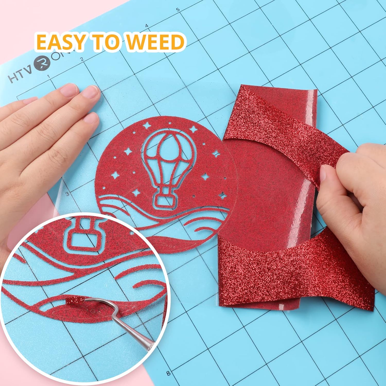 - 【Easy to Cut & Weed & Transfer】Our HTVRONT glitter htv is thicker and smooth. With its good cutting application characteristics, you can get your designs to perfection without wasting excess glitter heat transfer vinyl. At the same time, our glitter iron on vinyl is very sensitive to temperature and pressure, just follow the instructions and you can easily transfer the vinyl to the fabric.