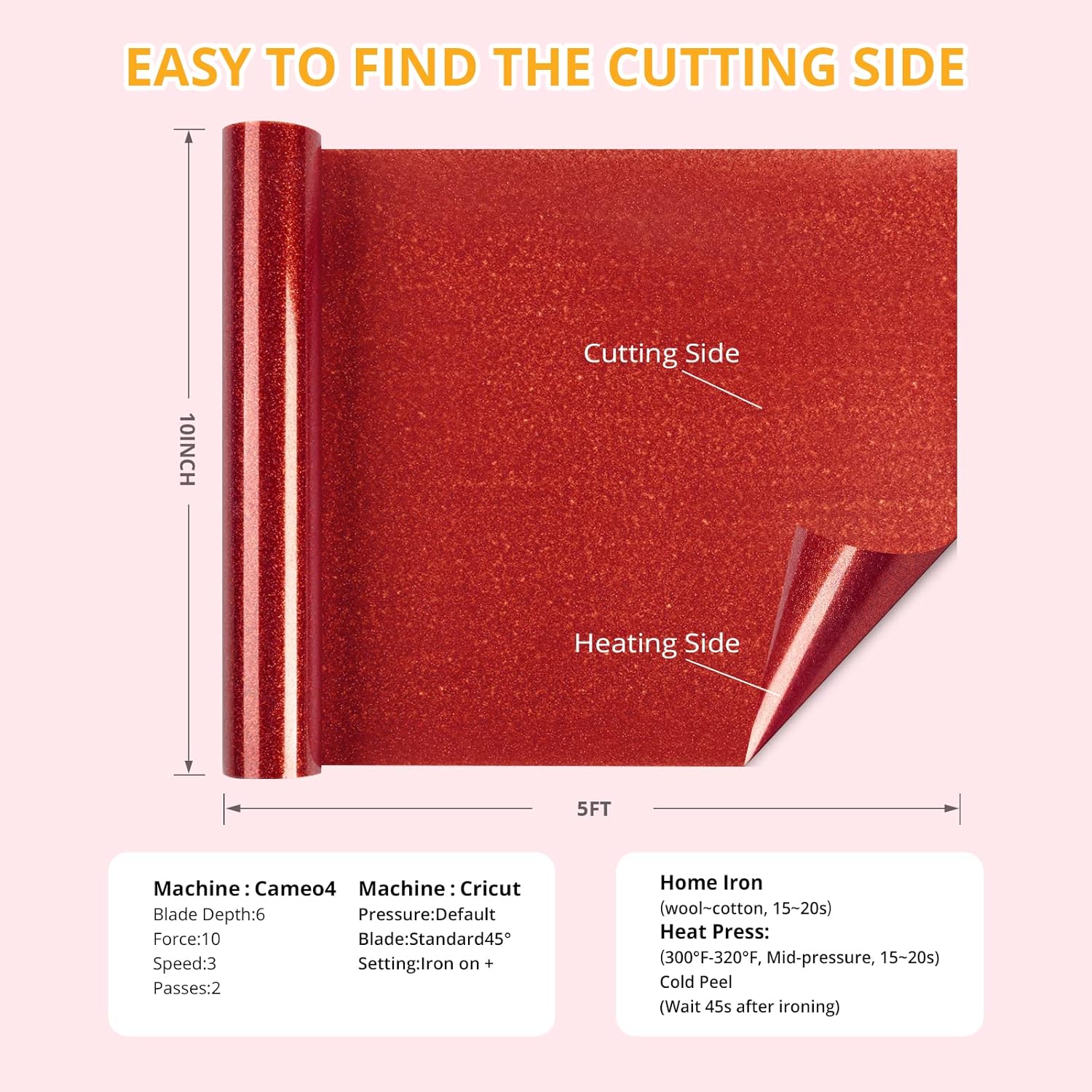 - 【Sparkle & No Residue】Our red glitter htv vinyl rolls are specially processed to give your designs a shinier look. Additionally, all of our glitters are embedded in vinyl and won't leave residues when weeding and won't fall from your project. Novices or professionals, big or small projects, this red glitter iron on vinyl roll is a great choice for you!