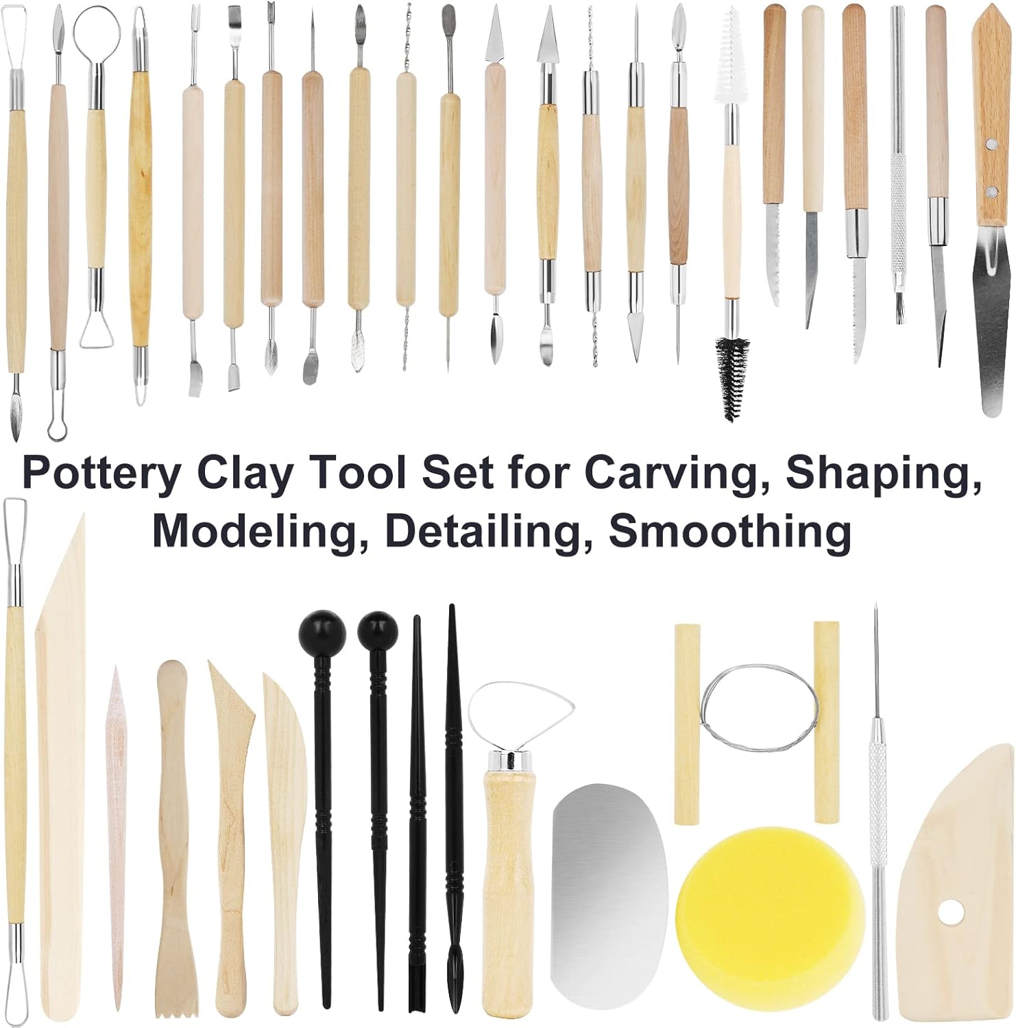 - Pottery Tools Kit: Set of 39 Pcs wooden clay tool set, include 8 pcs clay carving tools, 5 clay modeling tools, 4 plastic and 22 clay shaping and detailing tools, basically satisfy your need for carving, modeling, shaping, detailing, pressing, smoothing, cutting and so on. This 39 pcs ceramic tool kit is suitable for basic beginners, clay art lover and experts