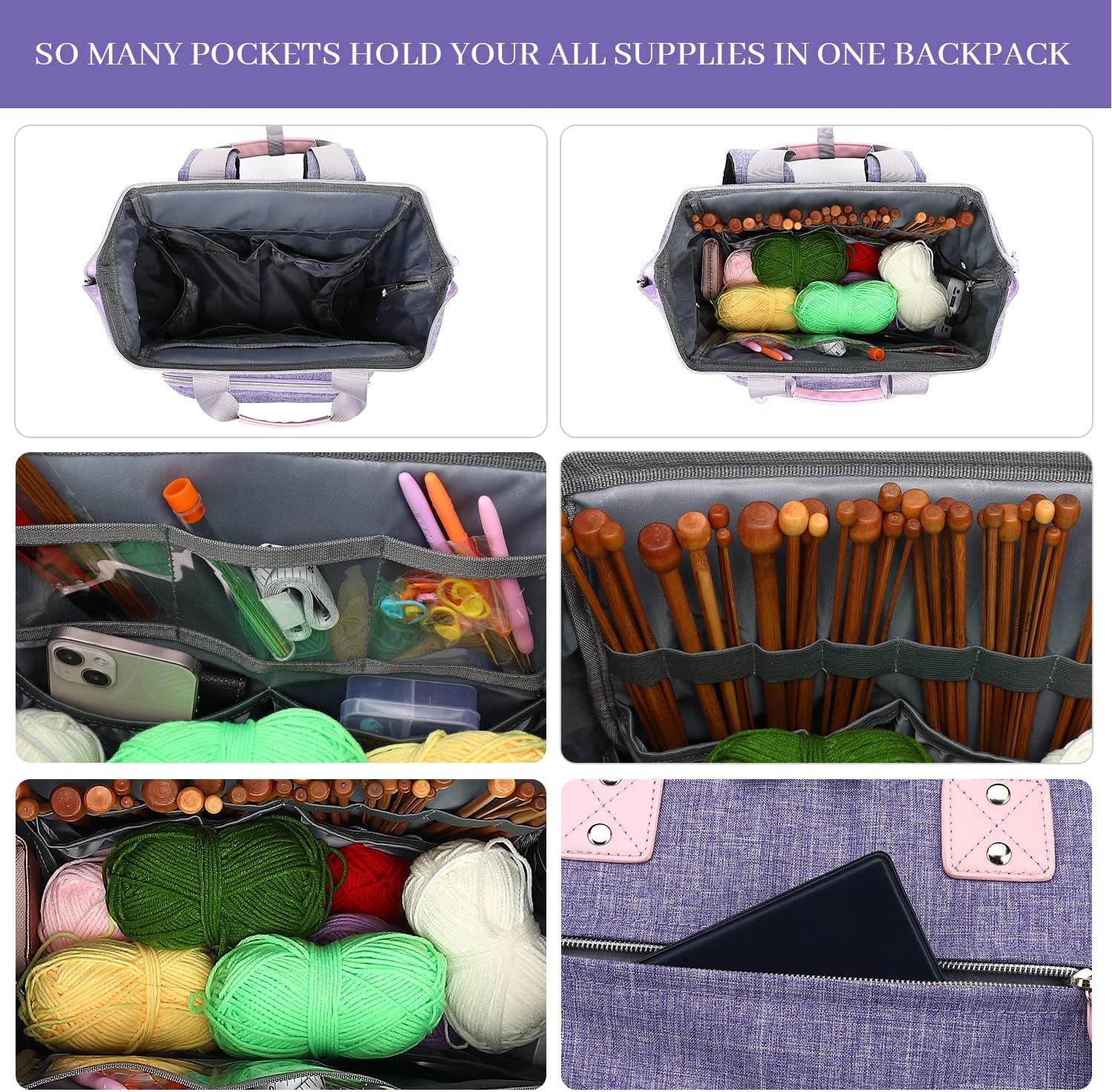 - Lots of Pockets & Compartments: 6 inner pockets with elastic straps fit up to 14βknitting needles and 3 clear inner pockets allow you to put your daily necessities. Front pouches and elastic loops for crochet hooks and accessories, side pockets for water bottle or umbrella, The oversized anti-theft pocket on the back of the backpack makes it easy to put your phone, passports, wallet and more.