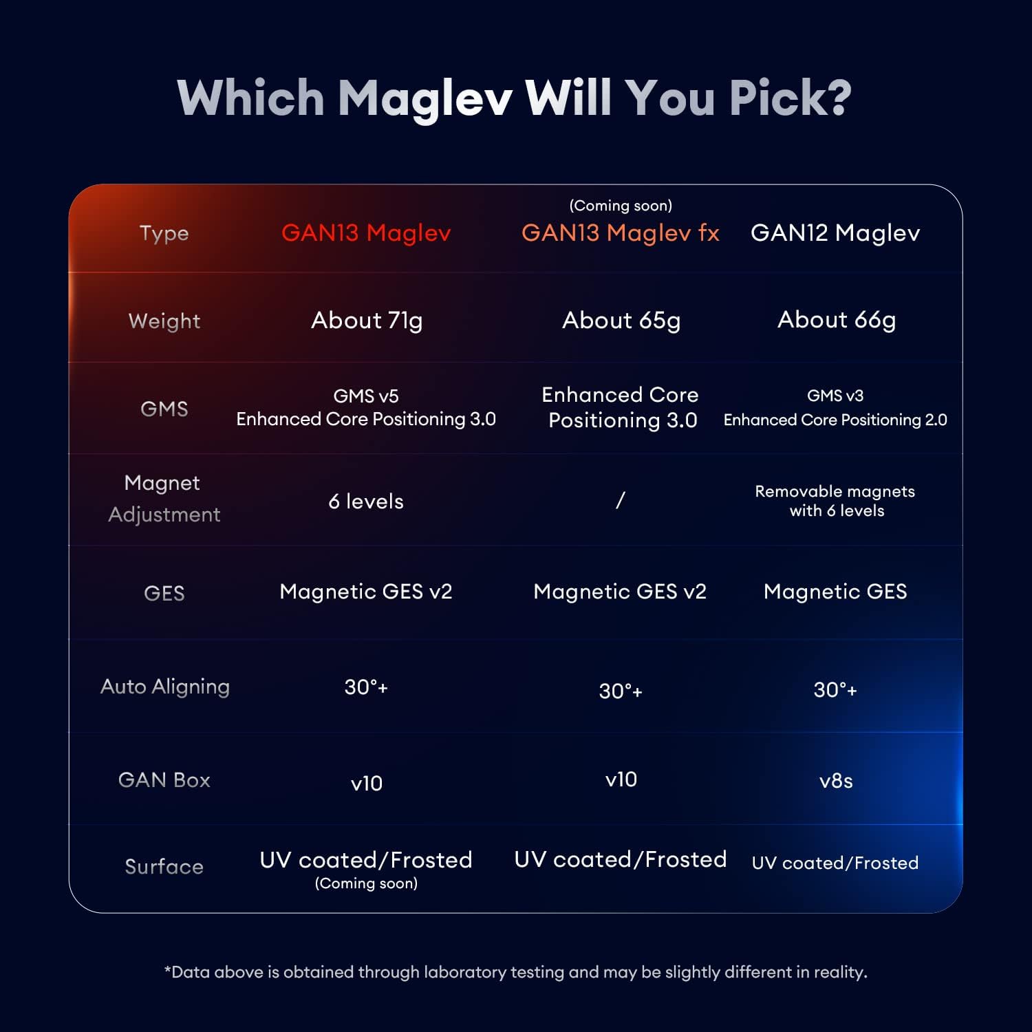 - A DUET OF MAGNET FORCES - GAN13 Maglev for the first time achieves the simultaneous action of magnetic repulsion and magnetic attraction, a big step towards the perfect performance of speed cube. Compared to GAN12 Maglev, it is better controlled and suitable for most speed cube lovers.