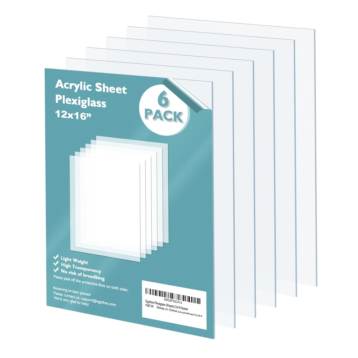 Egofine Plexiglass Sheets 6 Pack of 12x16’’ 0.04 Thick Clear Plastic Cast Transparent Plexi Glass Acrylic Sheets for Crafting Projects, Replacement Picture Frame Glass, DIY Display, Easy to Cut