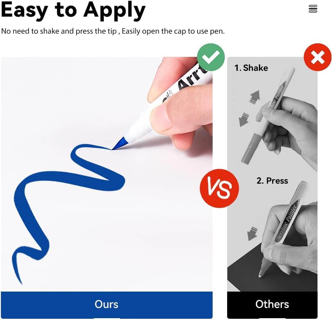 - Quik Dry and Water-Resistant When Dry: The highly pigmented paint is high covering, water-resistant, and abrasion proof allowing the application to any surface. Our Acrylic Paint Pens 30B are waterproof paint pens, it's permanent when dry. Note: Please tighten the cap and place the pen tip down if you don't use them.
