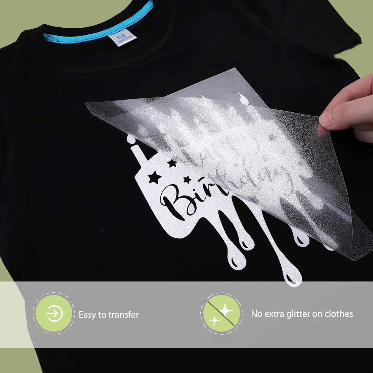 - 【EASY TO CUT WEED TRANSFER】The glitter htv is thick with an excellent cutting application characteristics, any cutters’ blade can cut it through easily. The medium tack transfer film makes weeding like a dream, the glitter heat transfer vinyl is extremely sensitive to heat and pressure makes transfer quickly, which will save your time. The glitter iron on vinyl is sensitive to temperature and pressure, which can be heat transferred on any t-shirt easily