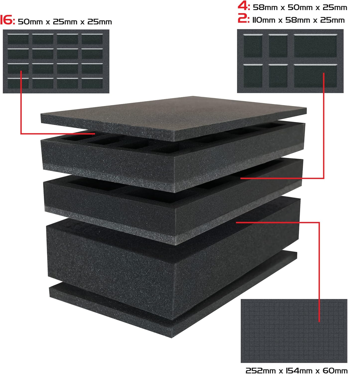 - MINIS BARRACKS – House your collection of PCs, NPCs, monsters across 3 integrated miniatures foam trays: 16-slot tray for 28mm figures, 8-slot tray for medium figures, and a customizable foam tray