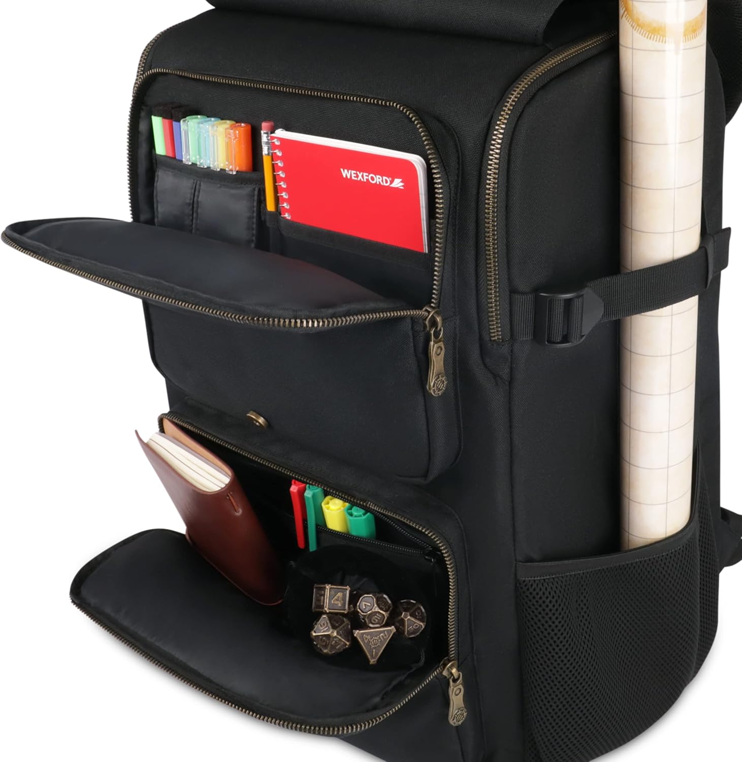 - GAME MASTER's CAMPAIGN BACKPACK – A D&D equipment chest with comfy straps designed to carry an adventurer's hoard of supplies: 6-8 RPG books, up to 18" laptop, 1-2 binders, DM screen, 25+ minis, more