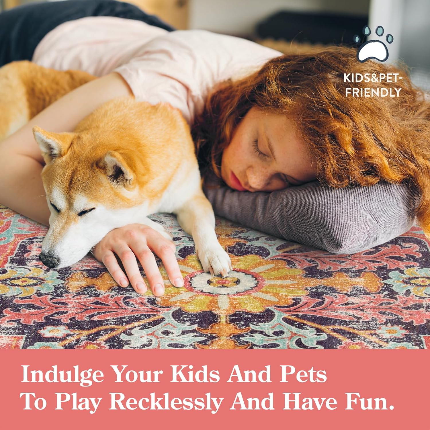 - [Exclusive Design Accent Rug] - This oriental area rug brings a vibrant color scheme and bohemian floral style print to your space. It mainly features a fuchsia, yellow stone, pretty light blue, pink ash brown design patterns, has a mystical quality that feels right out of a fairy tale, with purposeful distressing to add vintage appeal to your space.