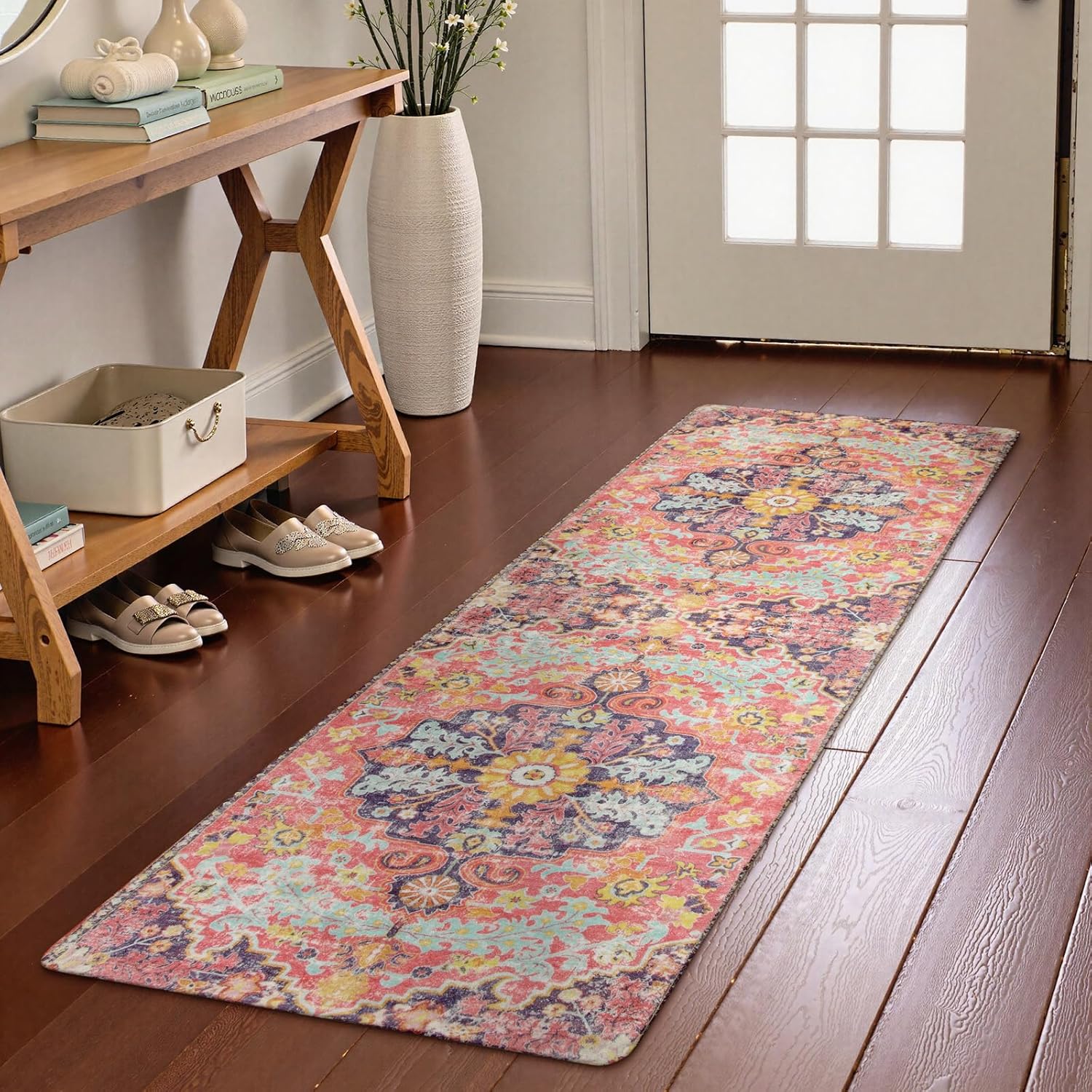 Lahome Bohemian Washable Runner Rugs with Rubber Backing, 2x7 Runners for Hallways, Vintage Floral Soft Non Slip Non-Shedding Faux Wool Stair Carpet Runner for Bathroom Kitchen Laundry, Fuchsia/Multi
