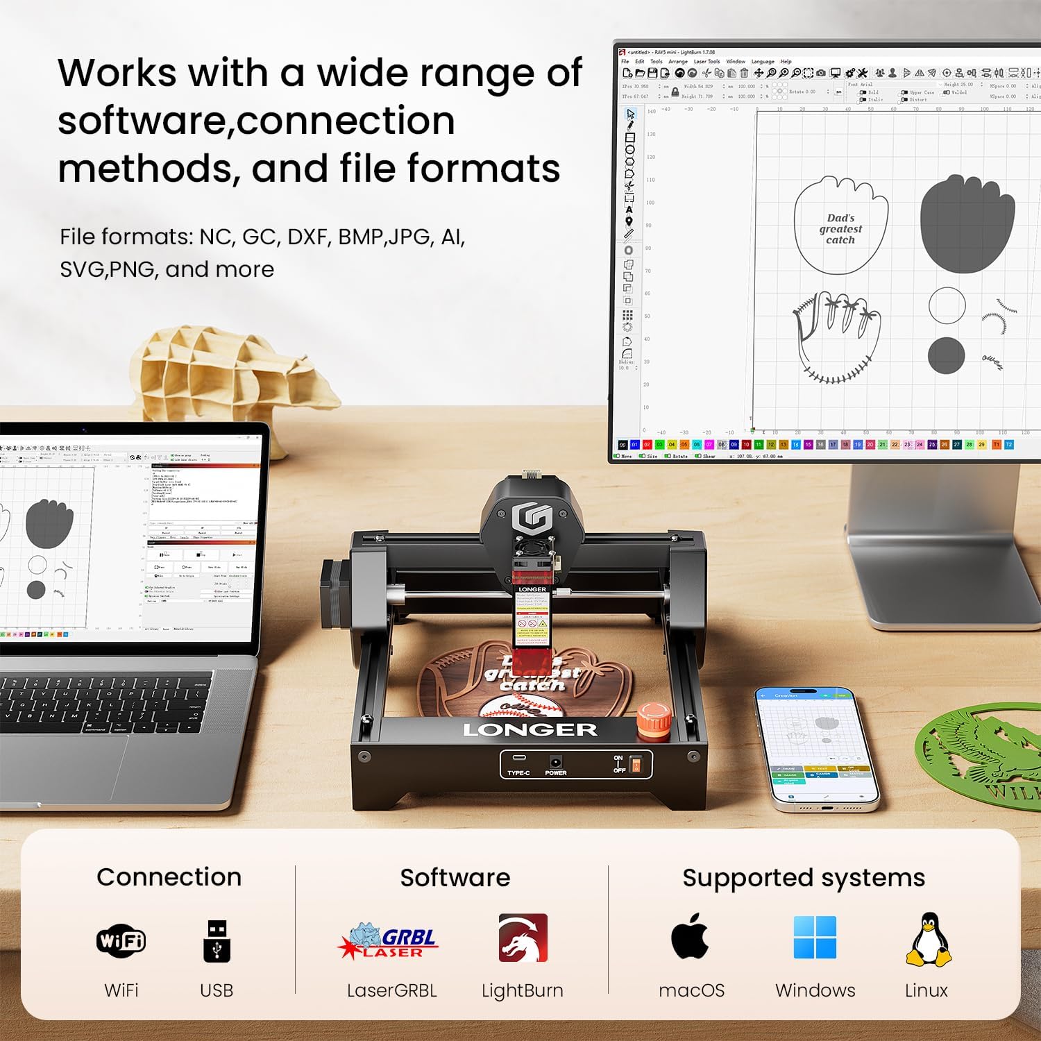 - WiFi & APP Control – Compatible with LaserGRBL and LightBurn software; built-in WiFi allows real-time operation via mobile APP for a more convenient workflow.