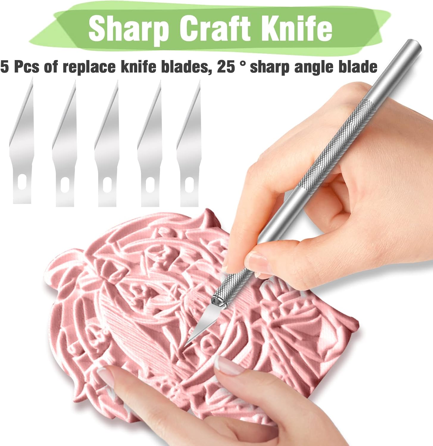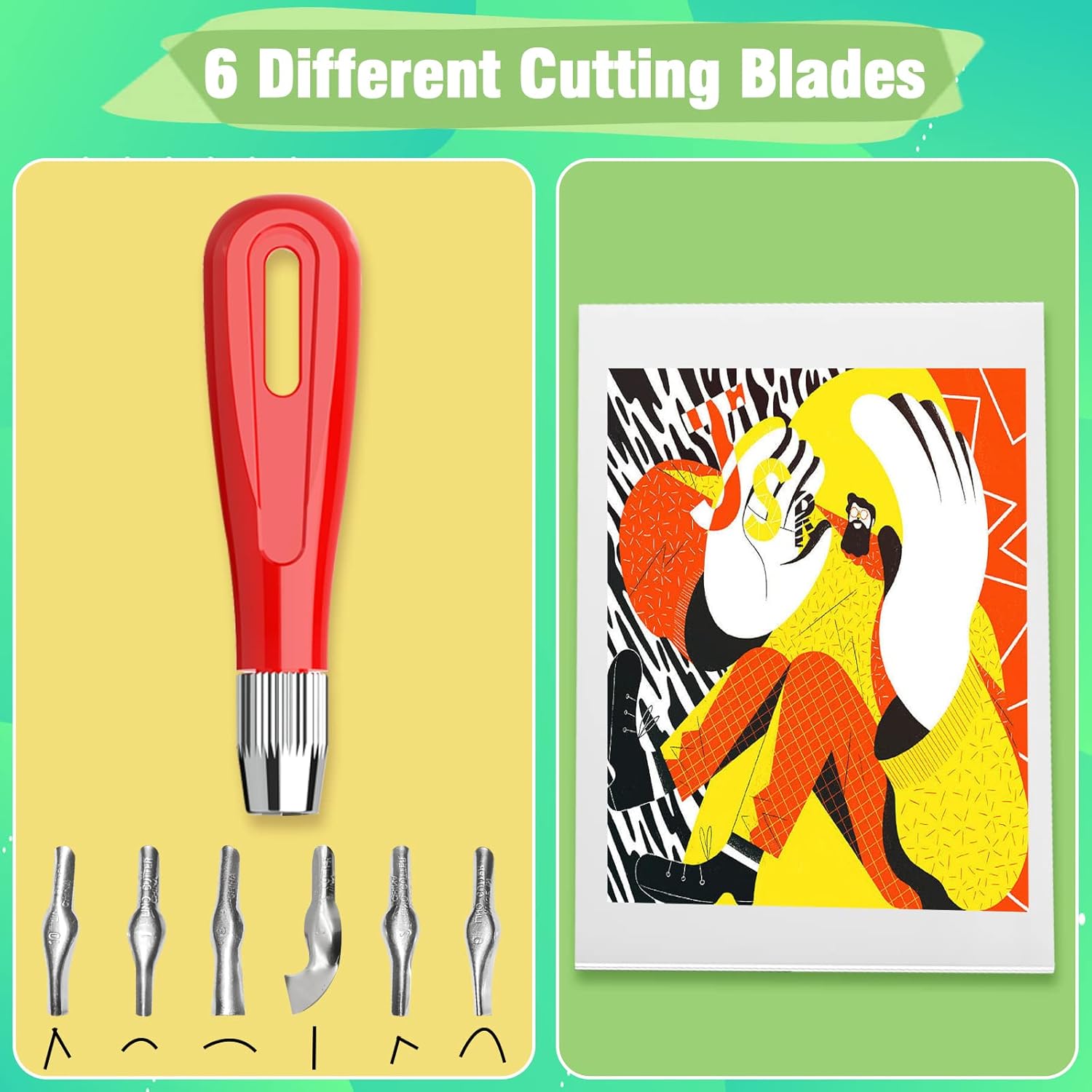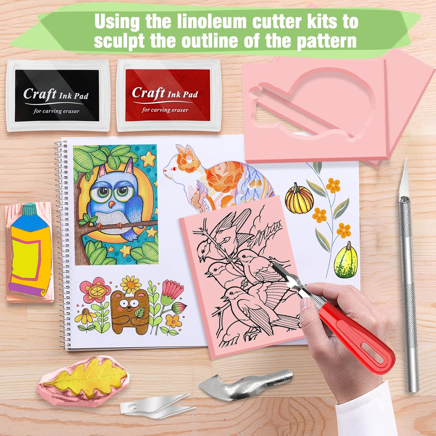 - What's Included: The package comes with 10 pcs rubber carving blocks, 1 linoleum cutter kit with 6 pcs types blades, 1 black ink pad,1 red ink pad, and 1 pc hobby knife including 5 pcs carving blades.