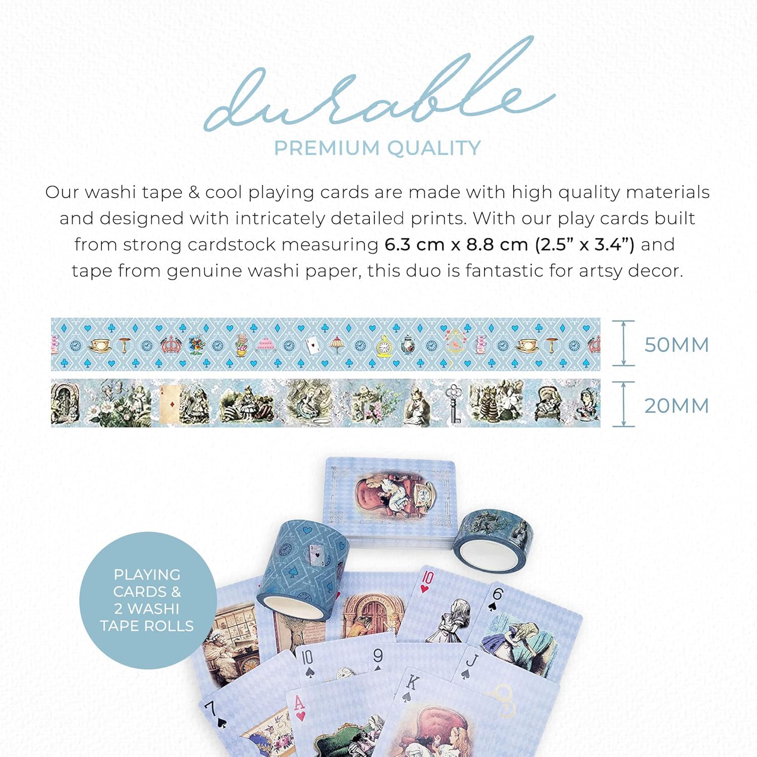 - Wonderful Wonderland Get-Togethers: Transform family game nights, travel games, and tea party–themed birthdays with our Blue Alice Adventures in Wonderland Playing Cards (6.29 cm x 8.81 cm / 2.48" x 3.47") and washi tape set. Perfect for card games, waterproof fun, and magical party decorations.