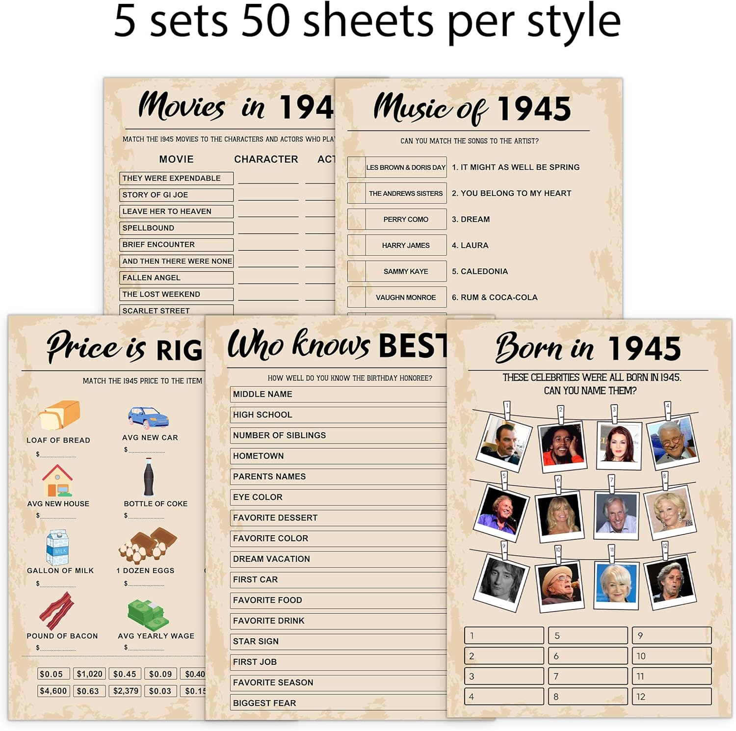 80th Birthday Party Games, Born in 1945 Games Bundle, Set of 5 Activities for 10 Guests, Birthday Party Supplies for Adults, Pack of 50 Cards