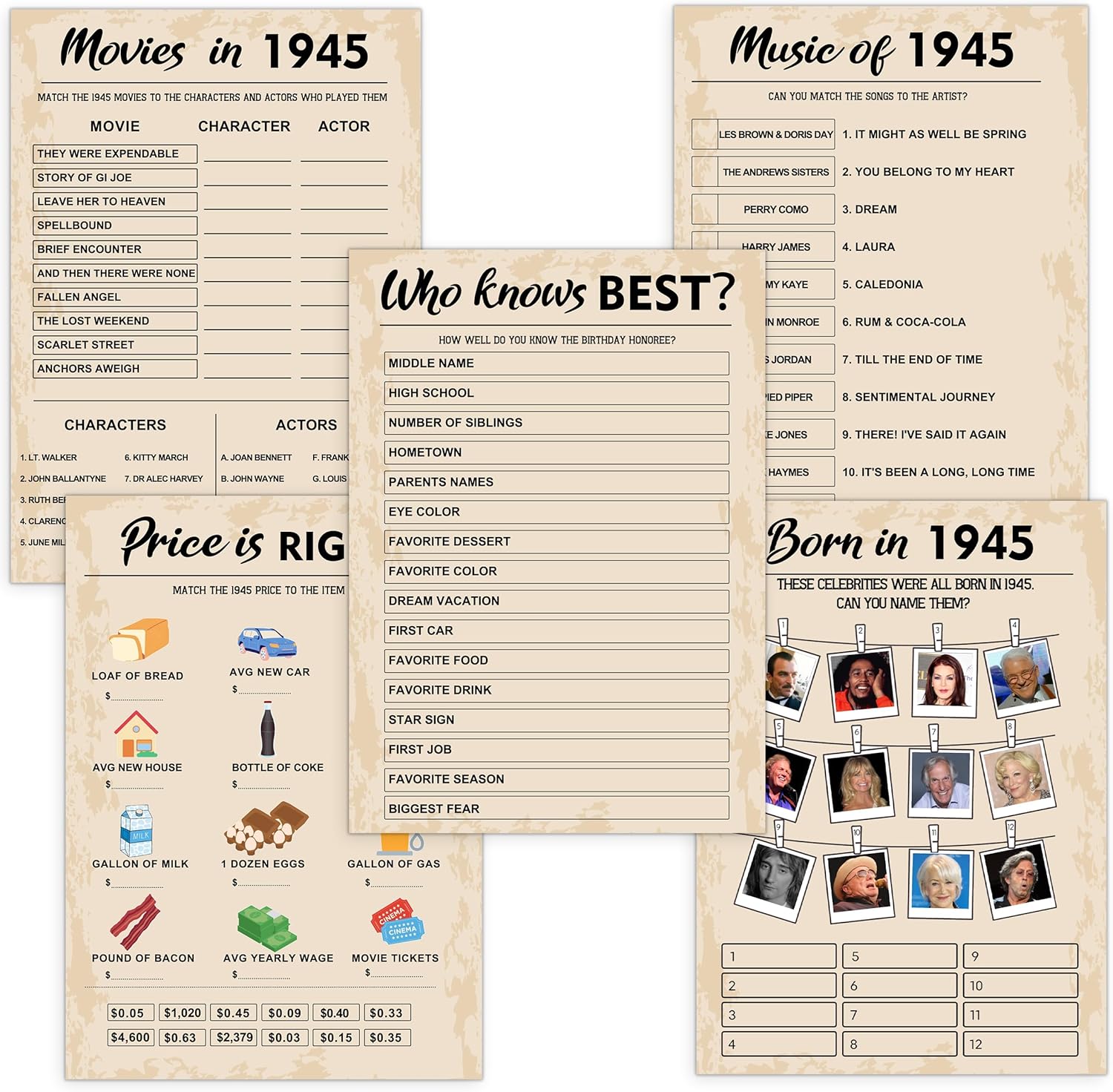- What’s included in the 80 Birthday Games Bundle: respectively [Guess the Celebrity Also Born in 1945], [Music of 1945], [Movies in 1945], [Price is Right] and [Who Knows Best]