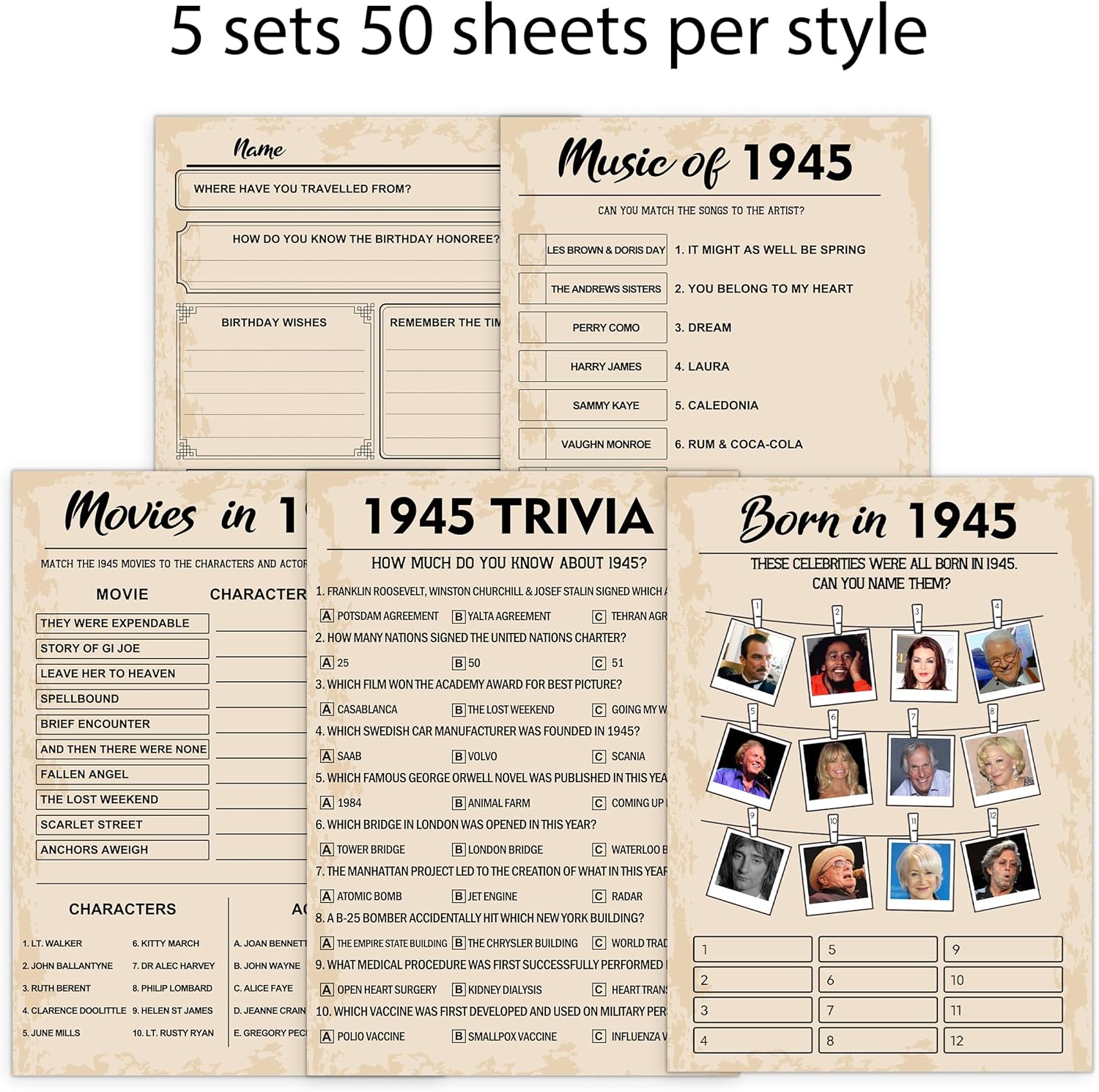 - What’s included in the 80 Birthday Games Bundle: respectively [Guess the Celebrity Also Born in 1945], [Music of 1945], [Movies in 1945], [Guest Book] and [1945 Trivia]