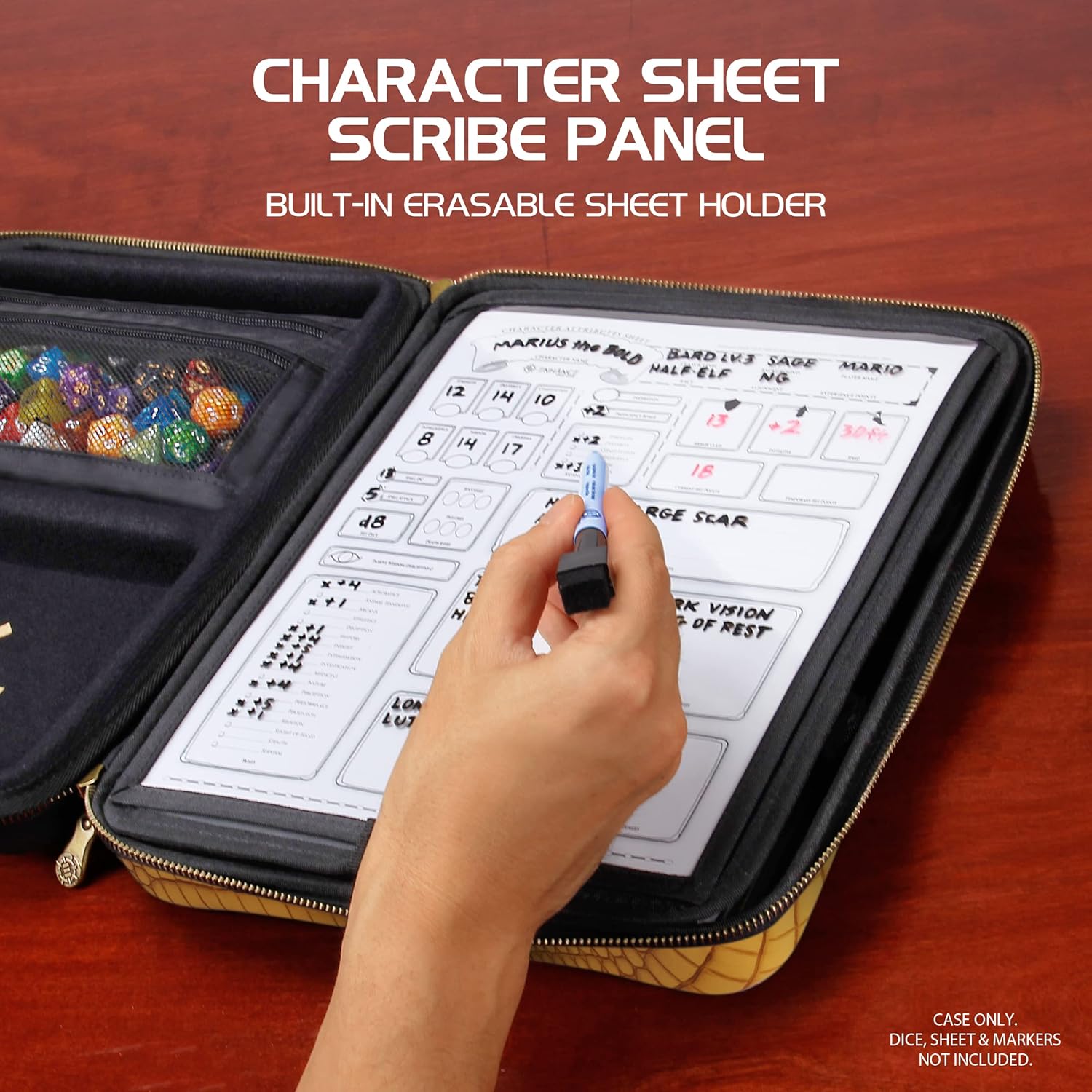 - BUILT-IN CHARACTER SHEET SCRIBE PANEL: Holds your Character Sheet in place with a transparent protector that's compatible with dry-erase markers for unrivaled convenience when updating vitals