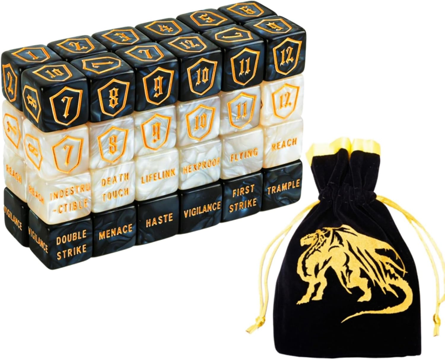 - PACKAGE INCLUDED: 24pcs MTG keywords D6 dices (FIRST STRIKE, VIGILANCE, MENACE, TRAMPLE, HASTE, DOUBLE STRIKE / LIFELINK, REACH, FLYING, HEXPROOF, DEATHTOUCH, INDESTRUCTIBLE) and 12 pieces 1-6 shield dice and 12 pieces 7-12 hield dice, a big dice bag