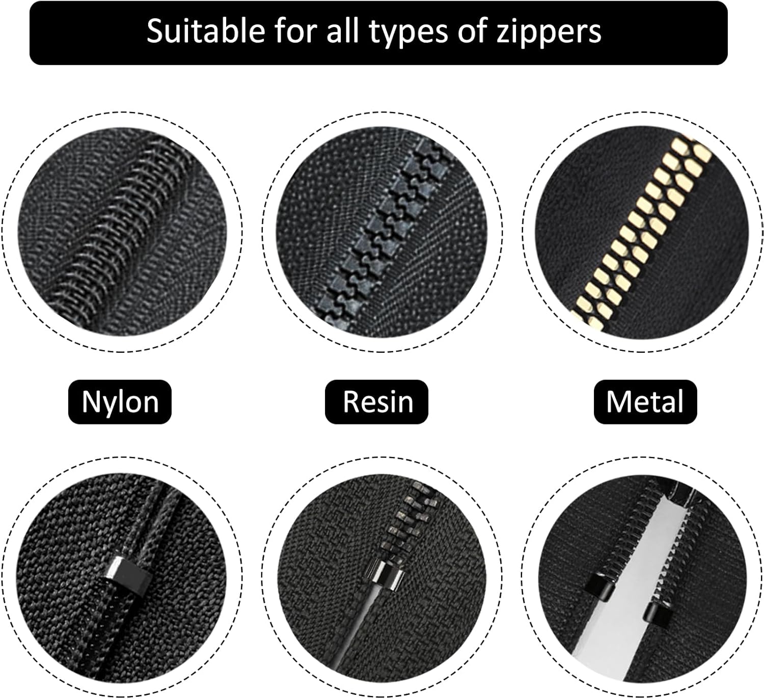 - 1.【Essential Information】Universal zipper repair kit includes 6 gold metal zippers, 6 black nylon zippers, 6 silver resin zippers, 3 silver metal zippers, 3 silver nylon zippers (size #3, #5 and #8); 8 zipper extension pulls, 36 zipper stop tops, 36 zipper stop bottoms and 1 zipper pliers. Confirm the size and type of your zipper before you buy.