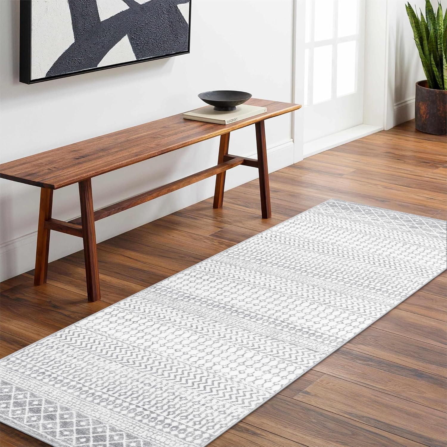 - Trendy Moroccan Design Rug: This farmhouse rug is designed with a Moroccan style pattern using a combination of geometric lines and shapes.The slight vintage feel created by the white and gray tones helps to establish a nostalgic atmosphere,suitable for promoting a cozy and inviting feel to your space