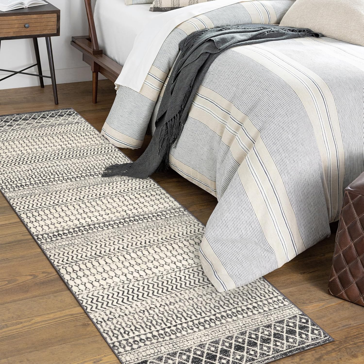 - Trendy Moroccan Design Rug: This farmhouse rug is designed with a Moroccan style pattern using a combination of geometric lines and shapes.The slight vintage feel created by the beige and black distressed tones helps to establish a nostalgic atmosphere.The bohemian rugs for bedroom aesthetic,suitable for promoting a cozy and inviting feel to your space