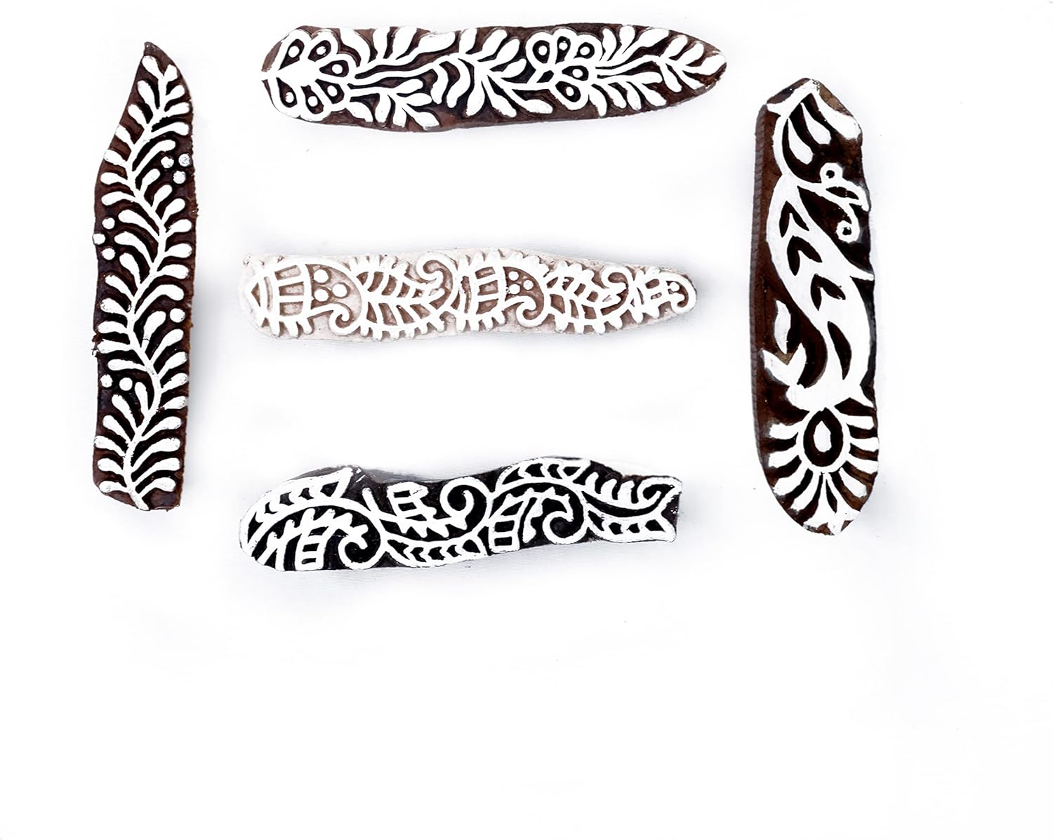 Hashcart | Set of 5 | Mehndi Print Blocks Border Pattern Wooden Stamp, Handcarved Indian Textile Printing Blocks for Crafting on Fabric Clay & Henna Tattoo Saree Border Paper Print Pottery Stamps