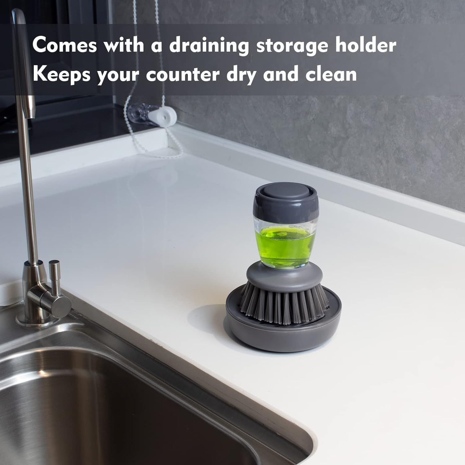 - 【Soap Dispensing Dish Brush】Dispenses dish soap on demand with the light push of the button, for a quicker and more efficient washing experience. The clear body allows you to check the remaining amount of detergent. Easily refill the dish soap by unscrewing the top cap.
