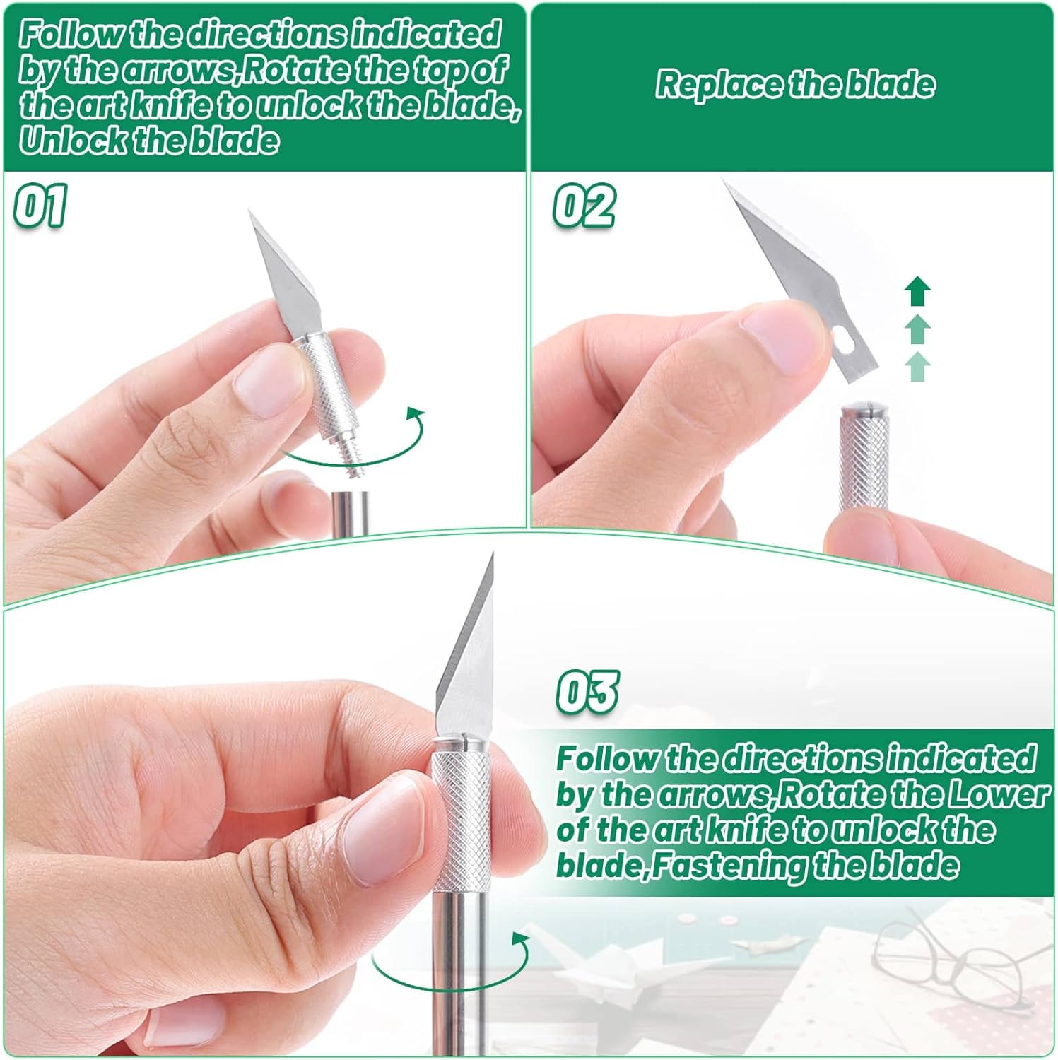 - 【Easy to Use】An easy-change blade art precision knife to unlock and secure the blades into place with a simple twist. It's the ideal tool for crafts, models, sewing, scrapbooking, card making, and other DIY projects.